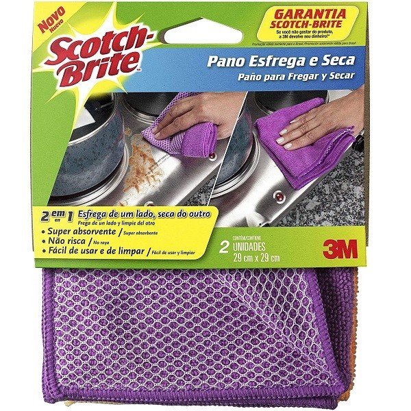 Cores diferentes, uma para cada cômodo da casa Exclusiva tela para limpeza de sujeiras encrustadas Super resistente e absorvente O Super Esfrega e Seca Scotch-Brite possui tela exclusiva para esfregar sujeiras mais difíceis. O lado felpudo é indicado para secar e dar acabamento à limpeza. Este produto apresenta alto poder de resistência e absorção, limpa sem danificar e não solta pelos. Pano diferenciado e inovador com dupla-face para limpeza em geral. Um lado com exclusiva tela 3M, para esfregar sujeiras mais difíceis. Prático, rápido e eficiente com um lado para você esfregar e o outro para secar.