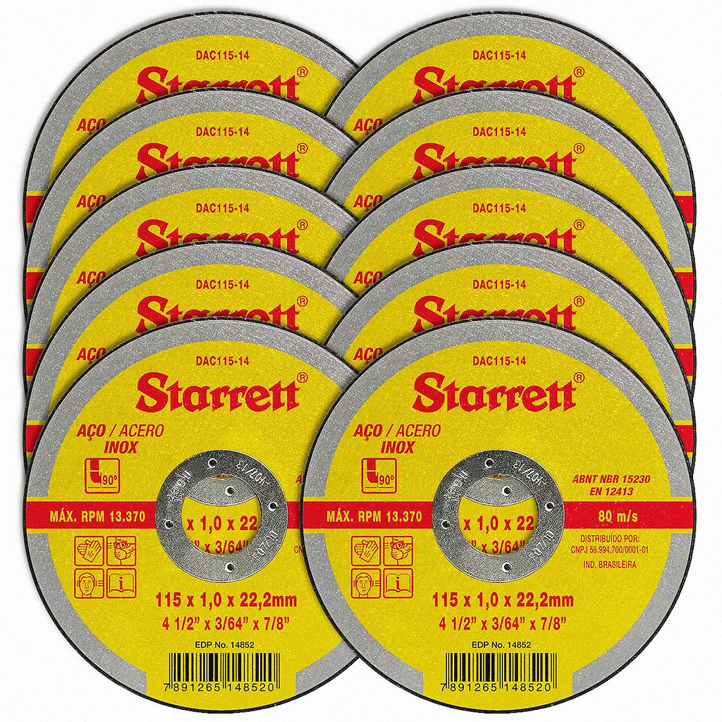 Kit 10 Discos Abrasivo Corte 115mm Aço / Inox Starrett DAC115-14 Descrição: - Os Discos Abrasivos de Corte Categoria Starrett são fabricados em conformidade com as normas EN 12413 e NBR 15230; - São ideais para o corte de materiais em aço carbono e aço inox, incluindo tubos, chapas, perfis, barras e outros materiais ferrosos; - Este produto é especialmente recomendado para uso em serralherias, construção civil e oficinas; - Tipo 41 (Corte); - Atendem às normas EN12413 / NBR 15230. Vantagens: - Estes discos abrasivos são utilizados em esmerilhadeiras angulares ou de bancada para trabalhos contínuos nas indústrias siderúrgicas, fundições, automotivas e estaleiros; - Também são adequados para trabalhos intermitentes em montagens industriais, serrilharias e construção civil; - Os Discos Abrasivos de Corte Categoria Starrett oferecem o melhor custo-benefício por corte, garantindo qualidade e segurança no uso. Dados Técnicos: - Marca: Starrett; - Modelo: DAC115-14; - Aplicação: Aço Carbono, Barras, Chapas, Inox, Materiais Ferrosos, Perfis, Tubos; - Diâmetro em Milímetro: 115mm; - Diâmetro do Furo em Milímetros: 22,23mm; - Espessura em Milímetro: 1mm; - Diâmetro em Polegadas: 4.1/2"; - Diâmetro do Furo em Polegadas: 7/8"; - Espessura em Polegadas: 3/64"; - Rotação - RPM: 13300; - Velocidade: 80 m/s. Itens Inclusos: - 10 Discos Abrasivos de Corte 115mm Aço / Inox Starrett DAC115-14. SKU (uso interno): 542206