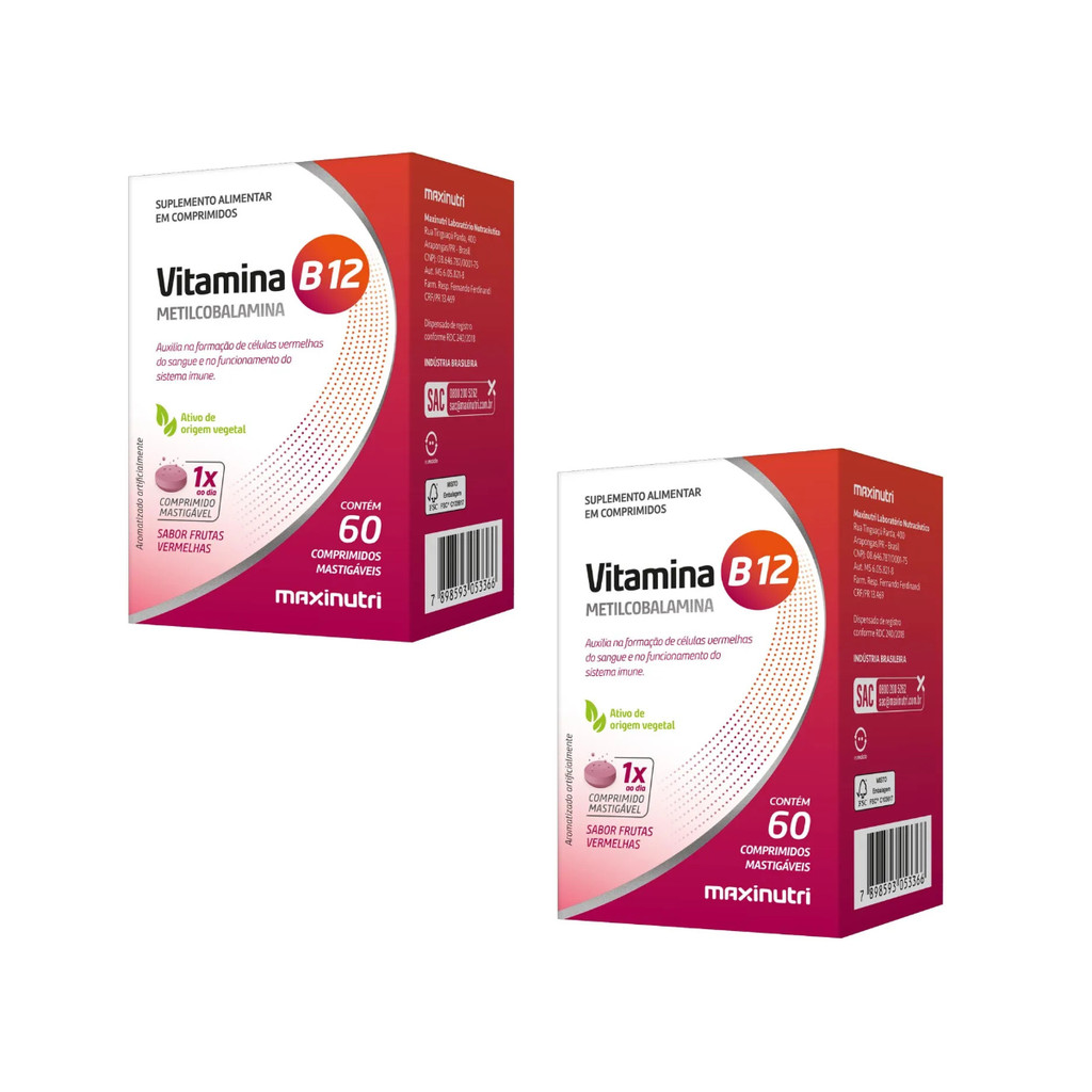 O que é a Vitamina B12 Mastigável Maxinutri? A Vitamina B12 Mastigável Maxinutri é um suplemento projetado para fornecer uma dose diária de vitamina B12 de forma prática e saborosa. Com sua fórmula em comprimidos mastigáveis, oferece uma maneira deliciosa e eficaz de manter sua saúde e vitalidade em dia. Para que serve a Vitamina B12 Mastigável Maxinutri? A vitamina B12 é essencial para várias funções no organismo, incluindo a produção de glóbulos vermelhos, o funcionamento adequado do sistema nervoso e a manutenção da saúde mental. Este suplemento ajuda a garantir que você obtenha a quantidade necessária dessa vitamina vital.