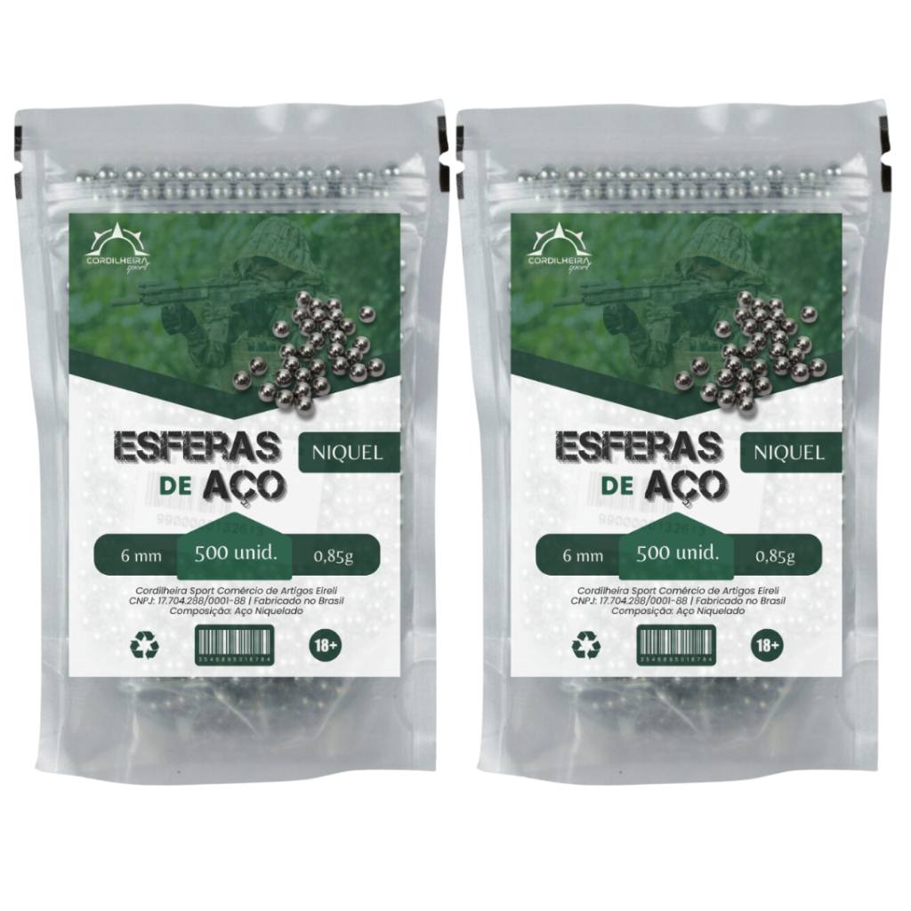 LOJA CORDILHEIRA SPORT! 2 PACOTES 500 ESFERAS DE AÇO 6MM 0,85G Descrição: Esferas de aço Cordilheira Sport fabricadas em aço níquel, não enferrujam, excelente munição para armas de airgun, também podendo ser utilizadas como munição em estilingues. Características: Marca: Cordilheira Sport Calibre: 6mm Peso da esfera: 0,85g Quantidade: 500 unidades Material: Aço Niquelado Itens Inclusos: 1.000 Esferas de Aço 6mm Cordilheira Sport Garantia: 7 dias pelo vendedor. MANTENHA O PRODUTO LONGE DO ALCANCE DE CRIANÇAS. Todos os produtos anunciados estão em estoque a pronta entrega. Só comercializamos produtos NOVOS e com NOTA FISCAL em nome do comprador e com garantia. Prezamos muito o nosso comprometimento com o cliente, todas as perguntas são respondidas o mais rápido possível COMPRANDO MAIS ITENS DA LOJA VOCÊ TEM DESCONTO NO FRETE!!! VER TODOS OS PRODUTOS DA LOJA EM: “VER MAIS ANÚNCIOS DO VENDEDOR” OU “PERFIL DA LOJA”