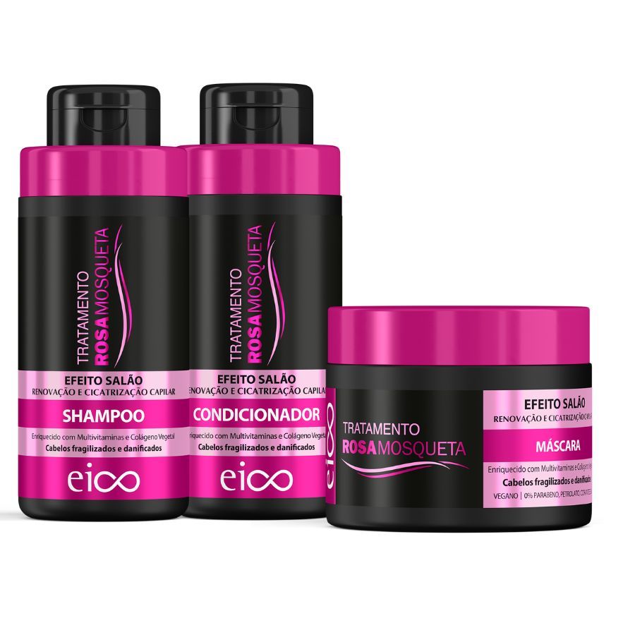 O Shampoo é ideal para a higienização diária, limpando os fios, sem ressecar. Ele também prepara o cabelo para outros tratamentos e mantém a saúde do couro cabeludo. O Condicionador possui ação reparadora. Ele sela e alinha as cutículas, facilita o desembaraço e proporciona brilho e maciez aos fios. Composição Óleo de Rosa Mosqueta: Extraído das suas sementes, é rico em ácidos graxos essenciais, vitaminas e antioxidantes. Possui ação cicatrizante, devolve a densidade e renova os fios fragilizados por processos oxidativos, químicos ou físicos. Multivitaminas + Colágeno vegetal: Uma combinação de ativos poderosos que reparam, hidratam e fortalecem profundamente os fios. Modo de uso: Aplique o shampoo na raiz dos cabelos e massageie suavimente até espumar. Enxágue por completo e repita o processo se precisar de uma limpeza profunda. Aplique o condicionador nos cabelos úmidos e massageie do comprimento ás pontas. Desembarace delicadamente os fios com os dedos, pente ou escova apropriada. Deixe agir por alguns minutos e enxágue bem. A Máscara age profundamente nos fios, repondo a massa capilar e raparando danos. Composição Óleo de Rosa Mosqueta: Extraído das suas sementes, é rico em ácidos graxos essenciais, vitaminas e antioxidantes. Possui ação cicatrizante, devolve a densidade e renova os fios fragilizados por processos oxidativos, químicos ou físicos. Multivitaminas + Colágeno vegetal: Uma combinação de ativos poderosos que reparam, hidratam e fortalecem profundamente os fios. Ações: Hidratação intensa, cicatrização profunda da fibra capilar, reforça a densidade dos fios, ato poder reparador, Repara a porosidade e devolve a força do fio, combate o ressecamento dos cabelos danificados, força, traz o vigor e condicionamento com maciez e proteção, repõe os lipídeos e combate o ressecamento, hidratação e nutrição e brilho intenso. Modo de uso: Aplique a máscara sobre os cabelos limpos e úmidos e enluve do comprimento às pontas, evitando a raiz. Use os dedos ou um pente para desembaraçar os fios delicadamente. Deixe agir de 5 a 10 minutos e enxague.