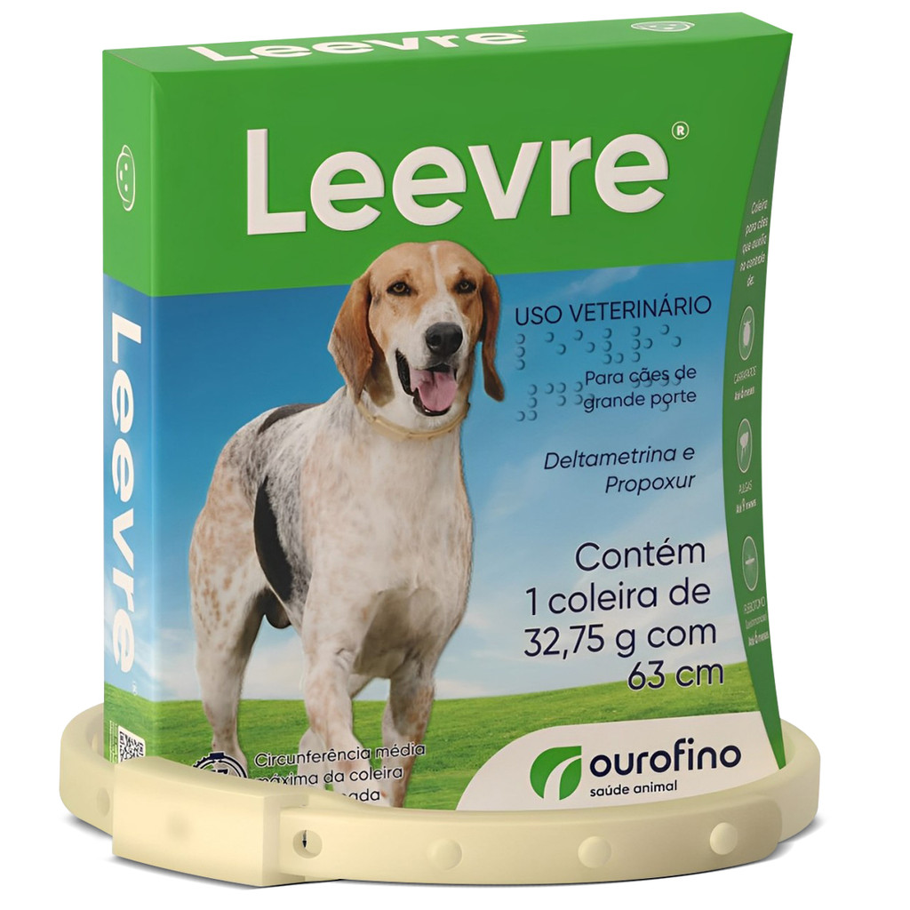 COLEIRA ANTIPULGAS OURO FINO LEEVRE G- 63 CM Leevre indicado como auxiliar no controle de infestaes pelos ectoparasitasCtenocephalides felis (pulgas) eRhipicephalus sanguineus (carrapato do co), e na repelncia e mortalidade Lutzomyia longipalpis, vetor da Leishmaniose Visceral Canina. A utilizao daLeevreauxilia, de forma indireta, a preveno da Dermatite Alrgica Picada de Pulgas (DAPP) e da verminose causada pelocestdeo Dipylidium caninum, ambas derivadas de infestaes porCtenocephalides felis(pulgas). FRMULA: Cada 100 g contm: Deltametrina .......... 4,00 g Propoxur .......... 12,00 g Veculo q.s.p. .......... 100,00 g MODO DE USO: Abrir a embalagem lacrada para retirar a coleira. Adaptar ao redor do pescoo do animal. Deixar folga de 2 dedos entre o pescoo e a coleira. Passar a coleira dentro da fivela plstica e travar os pinos de abotoar em 3 furos. A sobra dever ser cortada mais ou menos cinco centmetros aps o ltimo furo abotoado. Aps manusear a coleira para utilizao, lavar as mos com gua e sabo. Para animais em fase de crescimento deve-se acompanhar o ajuste da coleira ao redor do pescoo. Recomenda-se retirar a coleira antes do banho do animal e recoloc-la quando a pele estiver seca.