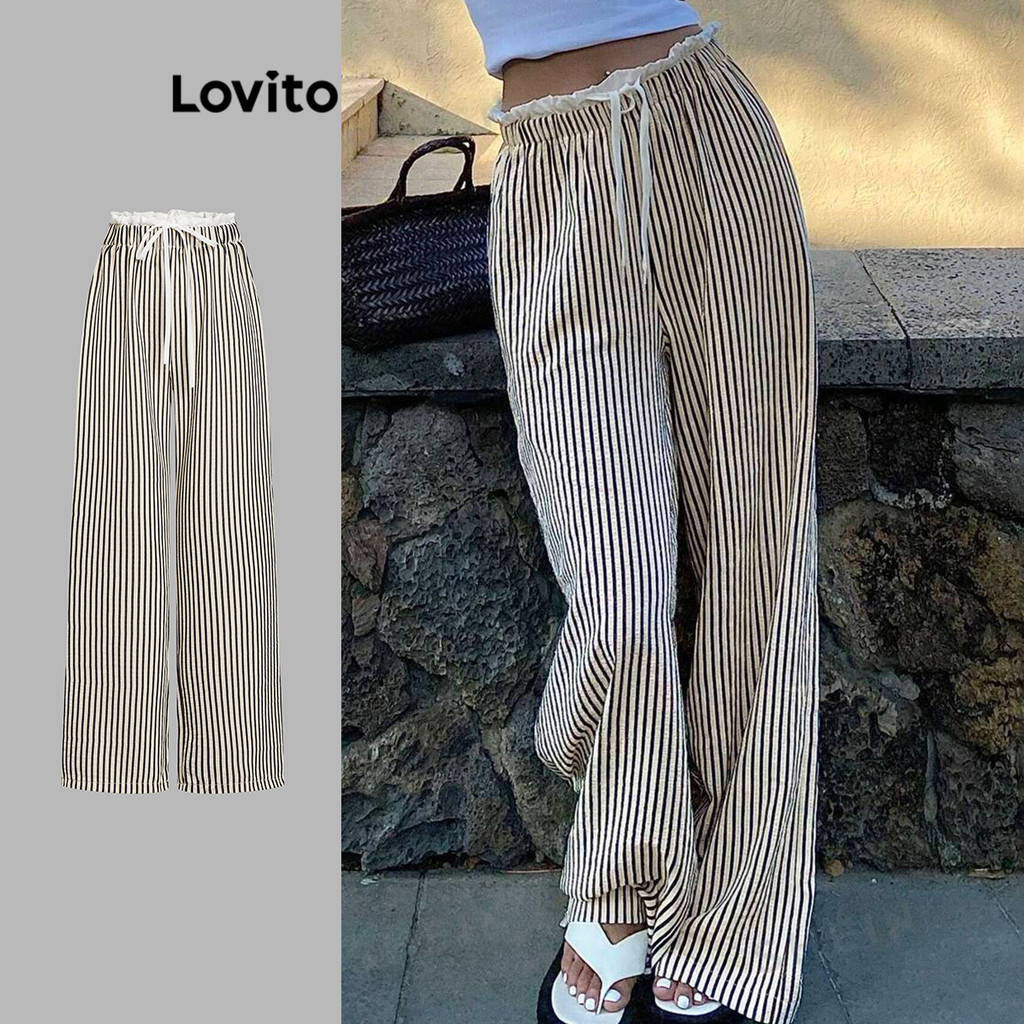 Lovito Calça Casual Listrada Com Costura Em Tecido Com Cordão E Gravata Frontal Para Mulheres L117AD087