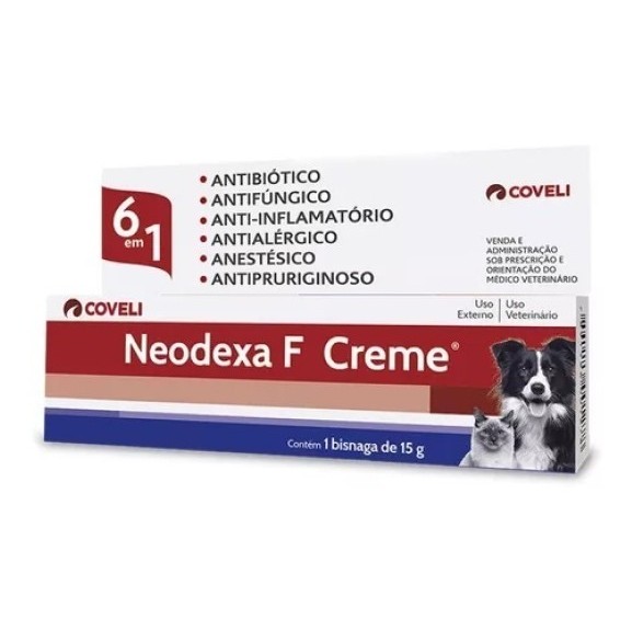 A LeluPets nasceu de uma paixão e dedicação de aproximadamente 20 anos de experiência nessa área tão incrível. Desde o início de nossa história, já são mais de 100 mil clientes atendidos. Estamos aqui determinados em fazer a diferença, democratizando e simplificando o cuidado com o seu pet para oferecer a melhor experiência para você e seu amiguinho. Mantemos nossas orelhas em pé, atentos às novidades do mundo pet para trazê-las até você. Nós somos apaixonados por pets! O seu pet é também da nossa família! Neodexa F Creme 15g 6 em 1 Coveli Para Cães e Gatos Neodexa F creme é comporta por antibiótico, antifúngico, anti-inflamatório, antialérgico, anestésico e antipruriginoso, tudo isso em um único produto, alia todos os tipos de coceira e irritação, evitando deixar nosso bichinho estressado e com ferimentos graves na pele. Indicado para cães, gatos e equinos, com aroma de aloe e vera, não deixa manchas na pele, assessora em tratamento de doenças de pele. Tudo que nossos animaizinhos precisam. - Indicado para cães, gatos e equinos; - Solução antibiótica, antifúngica, antialérgica, anti-inflamatório, anestésica e antipruriginoso - Não deixa manchas na pele; - Tratamento de ferimentos externos; - Assessora em tratamentos de doenças de pele; - Pode ser usado diariamente; - Atente-se à Neodexa F Creme bula e/ou informações da embalagem; - Consulte um médico veterinário de sua confiança para o uso apropriado deste produto; - Disponível em bisnaga de 15g.