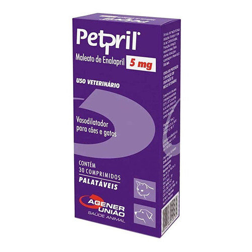 Petpril 30 Comprimidos Vasodilatador Agener União -Indicado para cães e gatos; -Trata da insuficiência cardíaca, hipertensão arterial sistêmica e renal; -Contém maleato de enalapril; -Comprimidos palatáveis; -Seguro e eficaz. Muitos bichinhos de estimação são afetados por doenças cardíacas, principalmente quando já estão com a idade avançada. Para ajudar no tratamento e a manter o bem-estar desses peludos, o medicamento Petpril é a solução ideal. O Vasodilatador Agener União Petpril 30 Comprimidos é um tratamento para cães com cardiomiopatia por redução da contratilidade ventricular e endocardiose mitral (doença valvar crônica), seguidas ou não de insuficiência cardíaca e congestão. E para gatos acima de 5 Kg, com insuficiência cardíaca, cardiomiopatia hipertrófica. Indicado também para tratamento da hipertensão arterial renal e sistêmica de cães e gatos. *Consulte sempre o Médico Veterinário de sua confiança para o uso apropriado deste produto. Leia a bula ou informações descritas na embalagem.