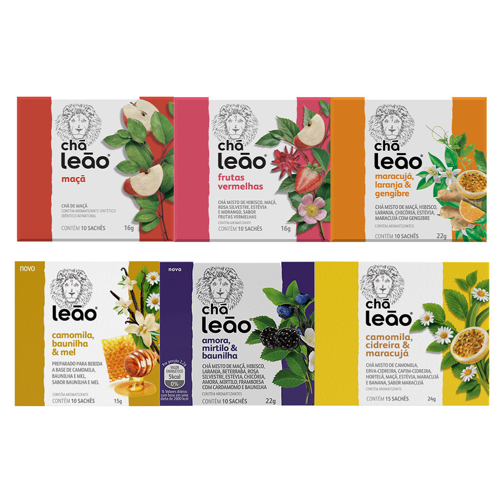 Sabor: Camomila com Baunilha e Mel, Frutas vermelhas, Maracujá- Laranja e Gengibre, Cidreira-Laranja e Limão, Amora-Mirtilo e Baunilha, Maçã. Aplicação: Chás para infusão. Embalagem: 6 (Seis) caixas com 10 (Dez) sachês. Totalizando 60 sachês, todos embalados individualmente. Porção: 1,6g (1 Sachê). Os chás não possuem quantidade significativa de valor energético, carboidratos, proteinas, gorduras totais, gorduras saturadas, gorduras trans, fibra alimentar e sódio. Fabricante: Leão Alimentos e Bebidas LTDA.