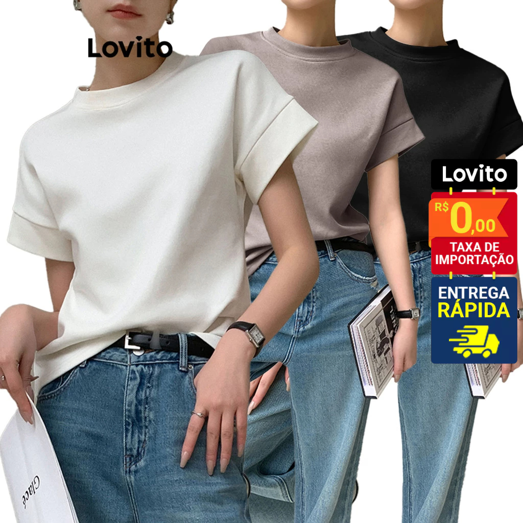Lovito Camiseta Casual Feminina de Manga Curta Lisa sem Cava com Detalhe na Manga LNE40575 - 72% OFF | Women Clothes