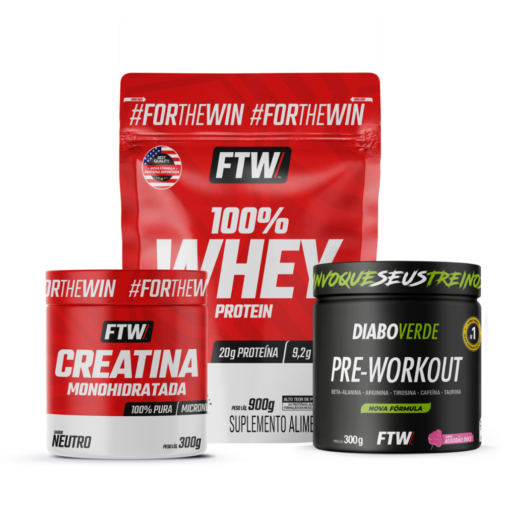 Kit FTW - Whey Protein 100% + Creatina Monohidratada + Pré-Treino Diabo Verde Desempenho, foco e recuperação em um combo completo para o seu treino. O Kit FTW reúne três suplementos que se complementam perfeitamente na rotina de quem treina com intensidade: Whey Protein 100%, Creatina Monohidratada Micronizada e o Pré-Treino Diabo Verde FTW, com fórmula concentrada à base de cafeína. Juntos, eles oferecem suporte nutricional para treinos de alta performance, com foco, energia e recuperação muscular eficiente. O que vem no kit 1x Whey Protein 100% FTW (900g - Sabor Doce de Leite) 20g de proteína por porção Fonte de aminoácidos essenciais, incluindo BCAAs Matéria-prima importada dos EUA Rápida absorção e alta digestibilidade Proteína que auxilia na formação dos músculos e ossos 1x Creatina Monohidratada Micronizada FTW (300g) 100% pura, sem aditivos Sem sabor – ideal para combinar com outros suplementos Micronizada para melhor absorção Auxilia no aumento do desempenho físico durante exercícios repetidos de curta duração e alta intensidade* 1x Pré-Treino Diabo Verde FTW (300g) Fórmula concentrada com cafeína, beta-alanina, taurina, arginina e tirosina Diversos sabores: Algodão Doce, Maçã Verde, Black Ice, Bala de Framboesa, entre outros A cafeína auxilia no aumento da capacidade de resistência e na melhora do estado de alerta* Por que escolher este kit? Suporte nutricional completo para o seu treino Energia e foco antes da atividade física Apoio à recuperação muscular pós-treino Auxílio na formação de músculos e melhoria do desempenho em treinos intensos Ideal para praticantes de musculação, cross training e esportes de alta exigência física Modo de uso sugerido Pré-Treino: diluir 5g (1 scoop) em 200 ml de água. Consumir de 15 a 30 minutos antes do treino. Creatina: ingerir 3g ao dia. Pode ser misturada com o pré-treino ou shake de whey. Whey Protein: diluir 30g em 200 ml de água ou leite. Consumir após o treino ou conforme recomendação profissional. Creatina: efeito benéfico obtido com o consumo diário de 3g. Cafeína: efeito benéfico obtido com o consumo de pelo menos 75mg por porção. Este produto não é um medicamento. Consulte um nutricionista ou médico antes de iniciar o uso.