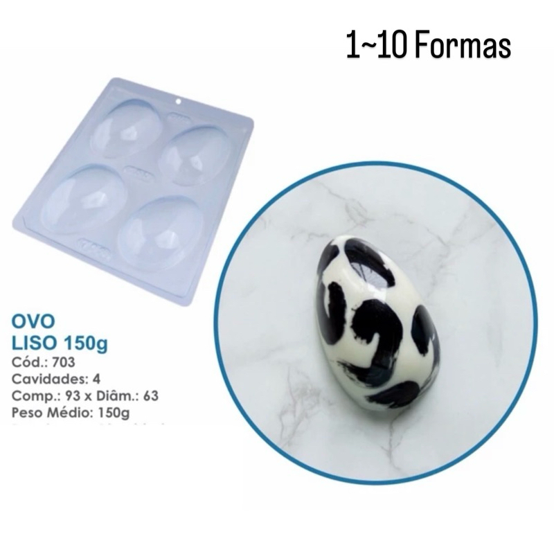 MODELO: OVO LISO 150g.- CÓD.:703 FORMA SIMPLES, IDEAL PARA PRODUÇÃO DE CHOCOLATES COM MUITO MAIS PRATICIDADE E PRECISÃO. POSSUI UMA "MARQUINHA" QUE INDICA A QUANTIDADE NECESSÁRIA DE CHOCOLATE, LEVANDO PARA GELADEIRA UMA ÚNICA VEZ. ELA PROPORCIONA UMA CASCA UNIFORME E UM ACABAMENTO PERFEITO SEMPRE COM O MESMO PESO. QUANTIDADE: 1 UNIDADE COR: TRANSPARENTE MATERIAL: ACETATO(PVC) DESCRIÇÃO DO PRODUTO CAVIDADES: 4 DIMENSÕES (mm) COMP.: 93 x DIÂM.: 63cm PESO MÉDIO: 150g
