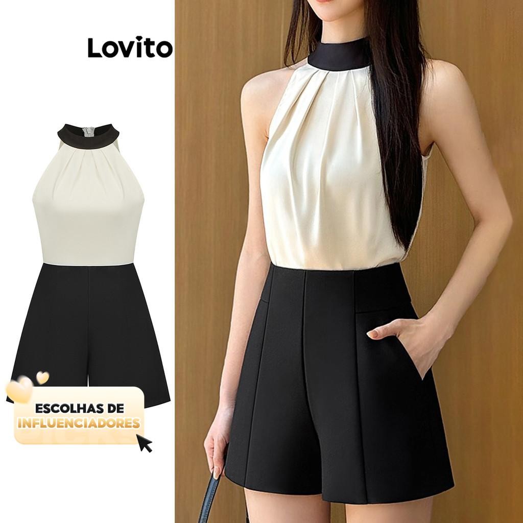 (KOL‘s pick) Lovito Macacão Casual Liso Plissado Colorblock Para Mulheres L95ED050 - 42% OFF | Women Clothes