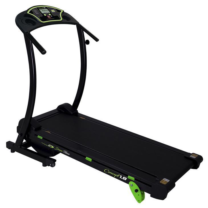 Esteira Elétrica Dream Concept 1.8, 6 Funções, Preto com Verde Características: Marca: Dream Fitness Modelo: Concept 1.8 Tipo: Esteira eletrônica residencial (dobrável) Cor: Chumbo e preto Especificações: Motor: 1,8 HP Velocidade: 1 a 12 km/h Níveis de inclinação: 3 (ajuste manual) Amortecimento: 6 amortecedores Monitor/Painel: LCD Funções do painel: Tempo, Velocidade, Distância, Calorias, Batimentos cardíacos e tecla Scan Área de caminhada: 100 x 33 cm Uso recomendado: Residencial Composição: Aço carbono e plástico Rodas de transporte: Sim Porta garrafa/suportes: Sim Voltagem: Bivolt Dimensões: Dimensões (C x L x A): 138,5 x 62 x 127,5 cm Peso do produto: 25,65 kg Peso máximo do usuário: 110 kg Ite ns inclusos: Esteira, chave de segurança e manual Garantia do fabricante: 6 meses *NÃO FATURAMOS PARA CNPJ