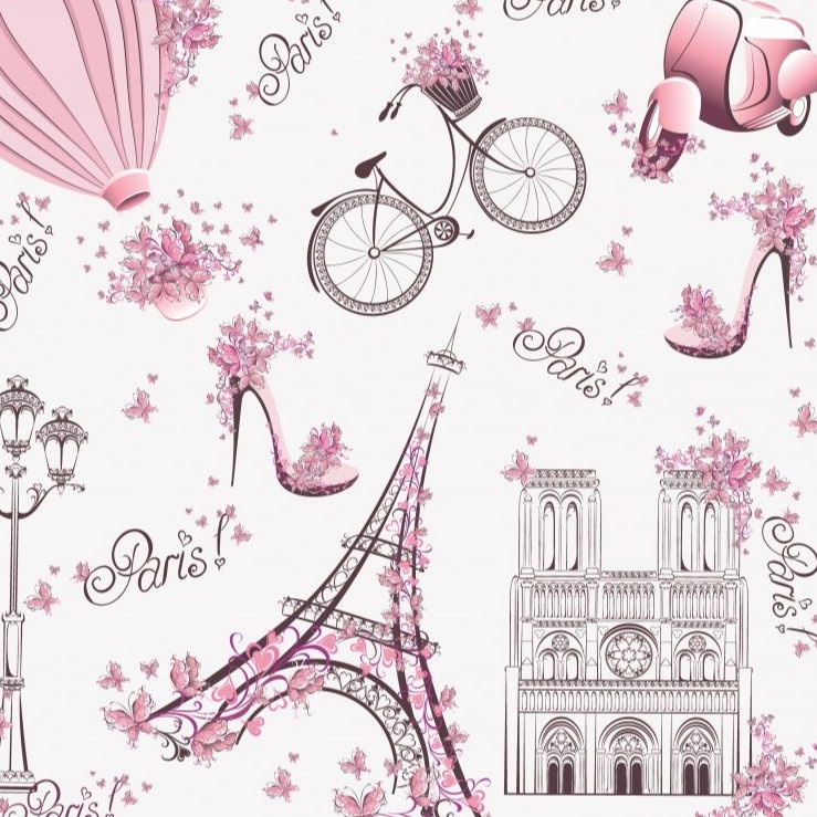 Papel de Parede Infantil Paris fundo rosa claro Lambretas e Flores Para Sala e Quarto