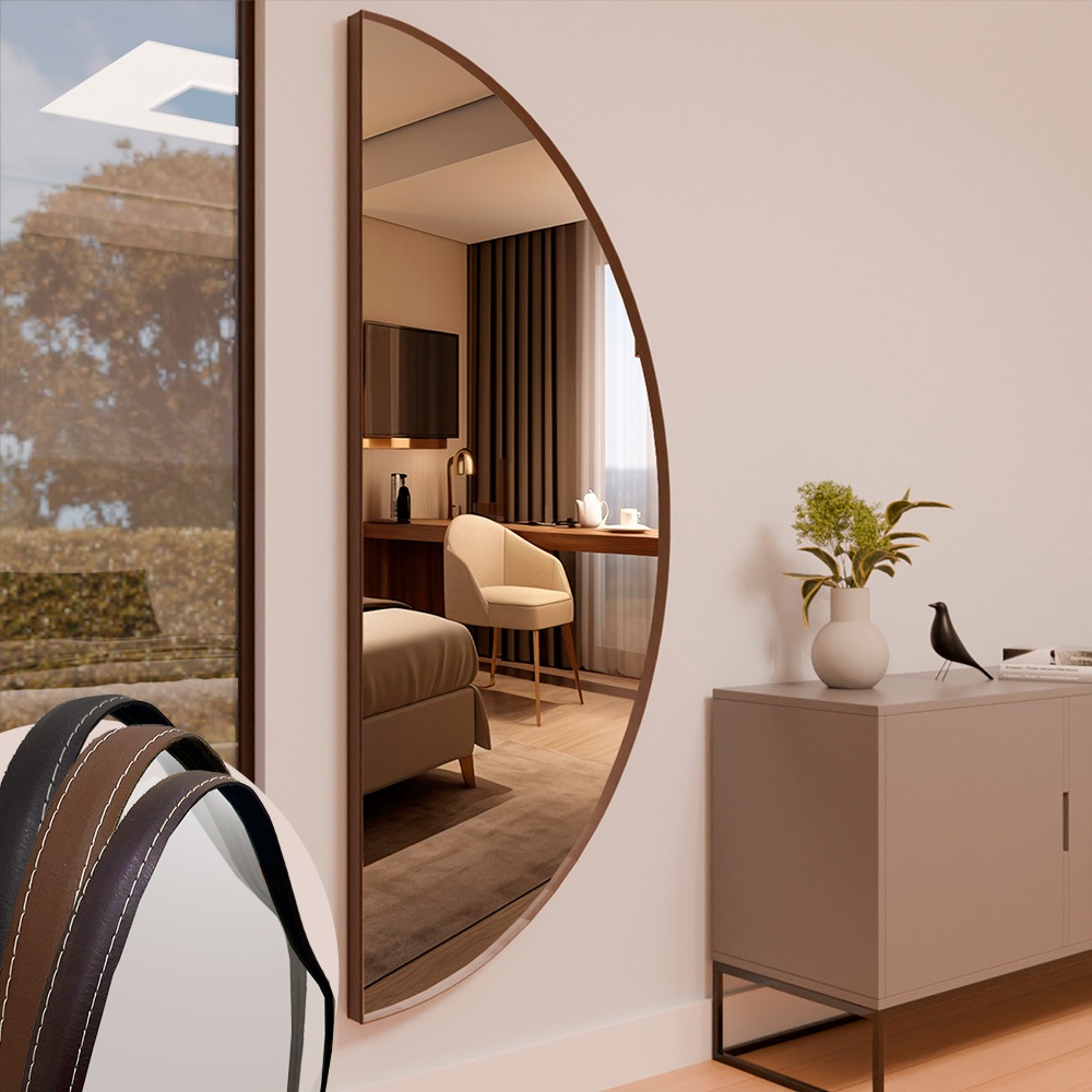 O espelho com moldura em couro é, sem dúvida, uma peça de decoração que exala tradição e elegância. Este tipo de espelho é ideal para quem deseja dar um toque de sofisticação e requinte aos espaços, seja em uma sala de estar, quarto ou até mesmo em um escritório. A moldura em couro não só traz uma textura diferenciada, mas também confere um charme clássico que se adapta a diversos estilos de decoração, desde o mais tradicional até o moderno. Além disso, o couro é um material durável e resistente, o que garante que o espelho mantenha sua beleza ao longo do tempo. Investir em um espelho com moldura em couro é apostar em um item que vai além de sua função prática, transformando-se em uma verdadeira obra de arte que valoriza e enriquece qualquer espaço. Sua presença traz uma sensação de acolhimento e distinção, tornando o ambiente mais convidativo e elegante. Nossos produtos passam por um rigoroso processo de fabricação, desde a seleção dos materiais até a embalagem final, as embalagens dos produtos são desenvolvidas com muito estudo, para evitar quebras durante o transporte, garantindo a segurança e integridade dos itens. Espelho com fundo em MDF a partir de 150x60cm. Tamanhos Disponíveis:110x50cm / 150x60cm / 170x70cm Selecionar o tamanho ideal na finalização da compra Espelho: 3mm Moldura em Couro: 3cm Diferencial - Fácil instalação - Alta durabilidade - Fácil limpeza - Excelente acabamento - Imagem não distorce Montagem: Instalação não inclusa na venda ou preço do produto, elas são de inteira responsabilidade do cliente. O espelho já vai com suporte fixado atrás, que permite a instalação na parede, caso não queira usar no chão. Instalação simples e segura. Aproveite a oportunidade de adicionar um toque de exclusividade à sua casa. * Imagens Ilustrativas.