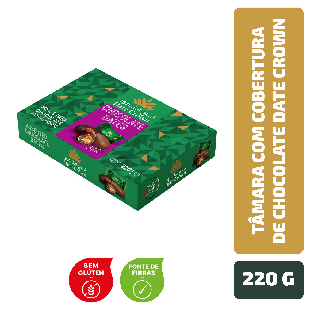As tâmaras Khalas Date Crown com cobertura de chocolate e recheadas com amêndoas são uma combinação deliciosa e sofisticada. Originárias do Oriente Médio, essas tâmaras premium são conhecidas por sua doçura natural e textura macia. Cada tâmara é cuidadosamente recheada com uma amêndoa crocante e coberta por uma camada de chocolate suave, resultando em uma experiência única de sabor. Além de deliciosas, são ricas em fibras, vitaminas e minerais essenciais, tornando-se uma escolha nutritiva e indulgente para lanches e sobremesas. TÂMARA COM COBERTURA AO LEITE E AMÊNDOA: INGREDIENTES: TÂMARA KHALAS SEM CAROÇO, COBERTURA DE CHOCOLATE AO LEITE (AÇÚCAR, GORDURA VEGETAL, CACAU EM PÓ, LEITE INTEGRAL EM PÓ, EMULSIFICANTE LECITINA DE SOJA E AROMA) E AMÊNDOA. NÃO CONTÉM GLÚTEN. CONTÉM LACTOSE. ALÉRGICOS: CONTÉM LEITE, AMÊNDOA E DERIVADO DE SOJA. PODE CONTER CASTANHA-DE-CAJU, CASTANHA-DO-PARÁ, PINOLI, PECÃS, AVELÃS, MACADÂMIAS, CASTANHAS, AMENDOIM, NOZES, PISTACHE. TÂMARA COM COBERTURA MEIO AMARGO E AMÊNDOA: INGREDIENTES: TÂMARAS KHALAS SEM CAROÇO, COBERTURA DE CHOCOLATE AMARGO (AÇÚCAR, GORDURA VEGETAL, CACAU EM PÓ, EMULSIFICANTE LECITINA DE SOJA E AROMAS) E AMÊNDOA. NÃO CONTÉM GLÚTEN. ALÉRGICOS: CONTÉM AMÊNDOA E DERIVADO DE SOJA. PODE CONTER CASTANHA-DE-CAJU, CASTANHA-DO-PARÁ, LEITE, PINOLI, PECÃS, AVELÃS, MACADÂMIAS, CASTANHAS, AMENDOIM, NOZES, PISTACHE. SEM GLÚTEN, FONTE DE FIBRAS.