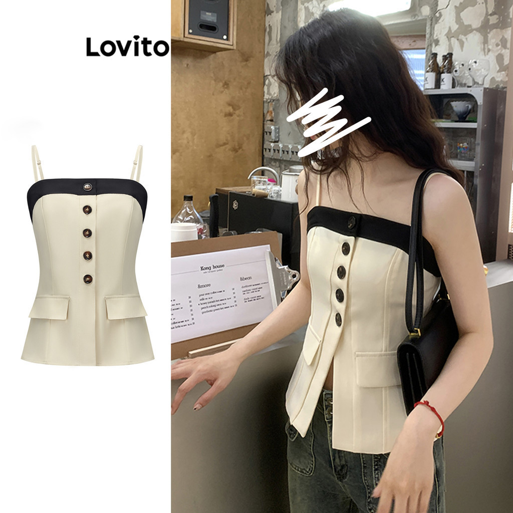 Lovito Regata Casual Lisa Colorblock Botão Falso Bolso Regata Para Mulheres L70AD031 (damasco) - 30% OFF | Women Clothes