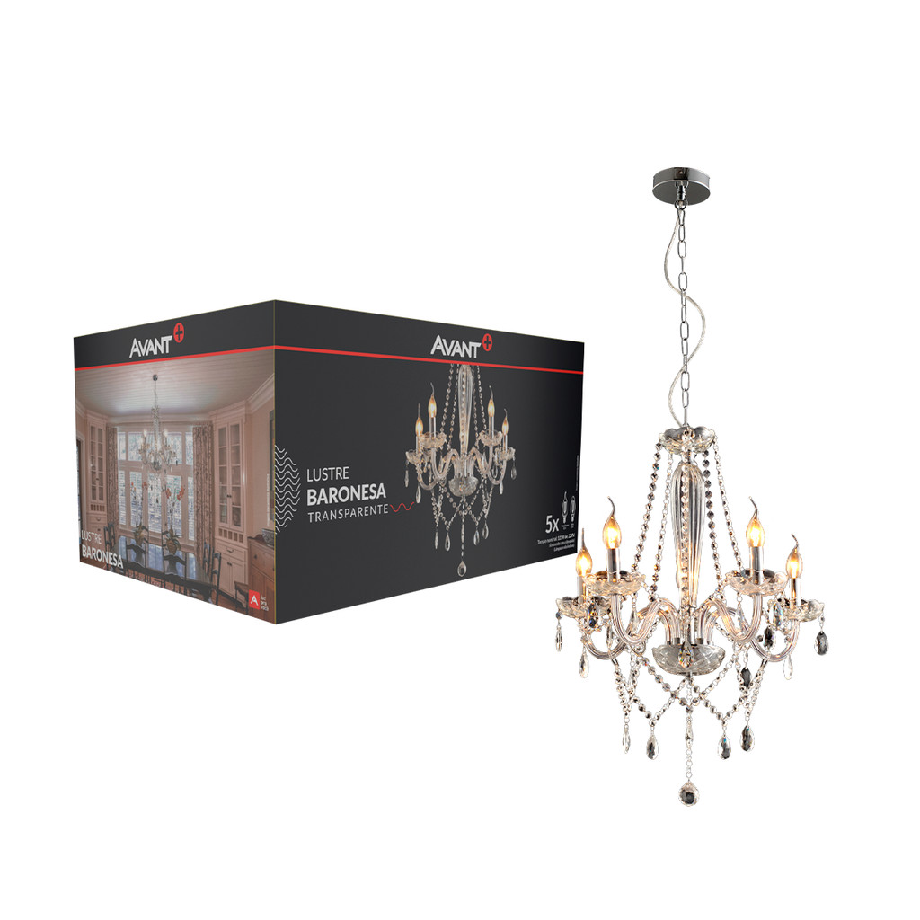 Lustre Baronesa - Cód. 785050072 PROPRIEDADES: O lustre Baronesa evoca a grandiosidade da nobreza europeia, trazendo à mente a beleza de catedrais, basílicas e castelos. Seus ornamentos conferem um toque de charme e personalidade, destacando um estilo clássico e, ao mesmo tempo, moderno, com suas formas curvas e a delicadeza dos vidros. CARACTERÍSTICAS DE FUNCIONAMENTO: Este lustre possui cabo ajustável em até 1,5 metro. Apresenta acabamento em vidro na cor Transparente, com 5 hastes e manopla em aço. A lâmpada indicada para uso é do tipo Vela ou Vela chama (E14). ESPECIFICAÇÕES TÉCNICAS E COMERCIAIS: Modelo: LUSTRE-BARONESA-VIDRO-TR-5XE14-CAN-CROMO Possível coloca até 5 lâmpadas E14 Cor: Transparente Potência Máxima: 5 x 15W Base: E14 Dimensões (mm): A: 580, B: 720, C: Ø120 Peso: 4000g Este produto possui Garantia Oficial da marca Avant de 12 meses para defeitos de fabricação. A garantia inicia-se na data da compra do produto, desde que sejam respeitadas as condições de uso descritas na embalagem, sendo necessário apresentar o Cupom ou a Nota Fiscal. Sobre a Marca: A Avant é uma marca consolidada no setor de iluminação, reconhecida por oferecer produtos que combinam design, qualidade e tecnologia. Com um portfólio diversificado, a marca busca atender aos mais variados estilos e necessidades, oferecendo soluções que transformam ambientes e agregam valor a projetos. Seus produtos se destacam pela durabilidade, eficiência e design inovador, proporcionando experiências únicas aos seus clientes.