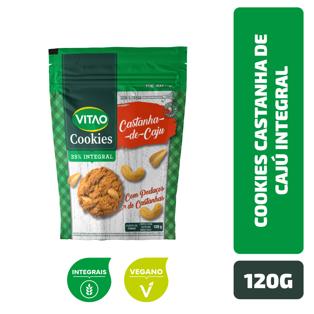 Os Cookies de Castanha-de-caju Vitao são leves, crocantes e feitos com ingredientes naturais de alta qualidade, como farinha de trigo integral e açúcar mascavo, o que os torna uma opção saudável e deliciosa. Com uma tradição pioneira no mercado brasileiro, os cookies Vitao se destacam por seu caráter mais artesanal e natural, proporcionando uma experiência única em sabor e textura. Perfeitos para o café da manhã, lanche ou qualquer momento do dia, eles são a escolha ideal para quem busca prazer sem abrir mão de um estilo de vida saudável. Experimente os Cookies Integrais Vitao com castanha-de-caju e surpreenda-se com sua crocância e o sabor especial das castanhas. Além de serem irresistíveis, eles são uma opção equilibrada para satisfazer sua vontade de doce, oferecendo um prazer indulgente com um toque de bem-estar. Experimente e surpreenda-se com sua crocância e o sabor especial das castanhas. Além de serem irresistíveis, eles são uma opção equilibrada para satisfazer sua vontade de doce, oferecendo um momento único. INGREDIENTES: Farinha de trigo integral, farinha de trigo enriquecida com ferro e ácido fólico, óleos vegetais (milho, soja e algodão), açúcar mascavo, extrato de malte, fécula de mandioca, castanha-de-caju, fibra de polidextrose, farinha de arroz, sal, edulcorantes xarope de maltitol e sucralose, emulsificante lecitina de soja, fermentos químicos bicarbonato de sódio, bicarbonato de amônio, pirofosfato ácido de sódio e fosfato monocálcico, acidulante ácido cítrico e aroma. ALÉRGICOS: CONTÉM CASTANHA-DE-CAJU, DERIVADOS DE TRIGO, CEVADA E SOJA. PODE CONTER AVEIA, AMÊNDOA, NOZES, CENTEIO E CASTANHA-DO-PARÁ. CONTÉM GLÚTEN. INTEGRAL, VEGANO, FONTE DE FIBRAS.