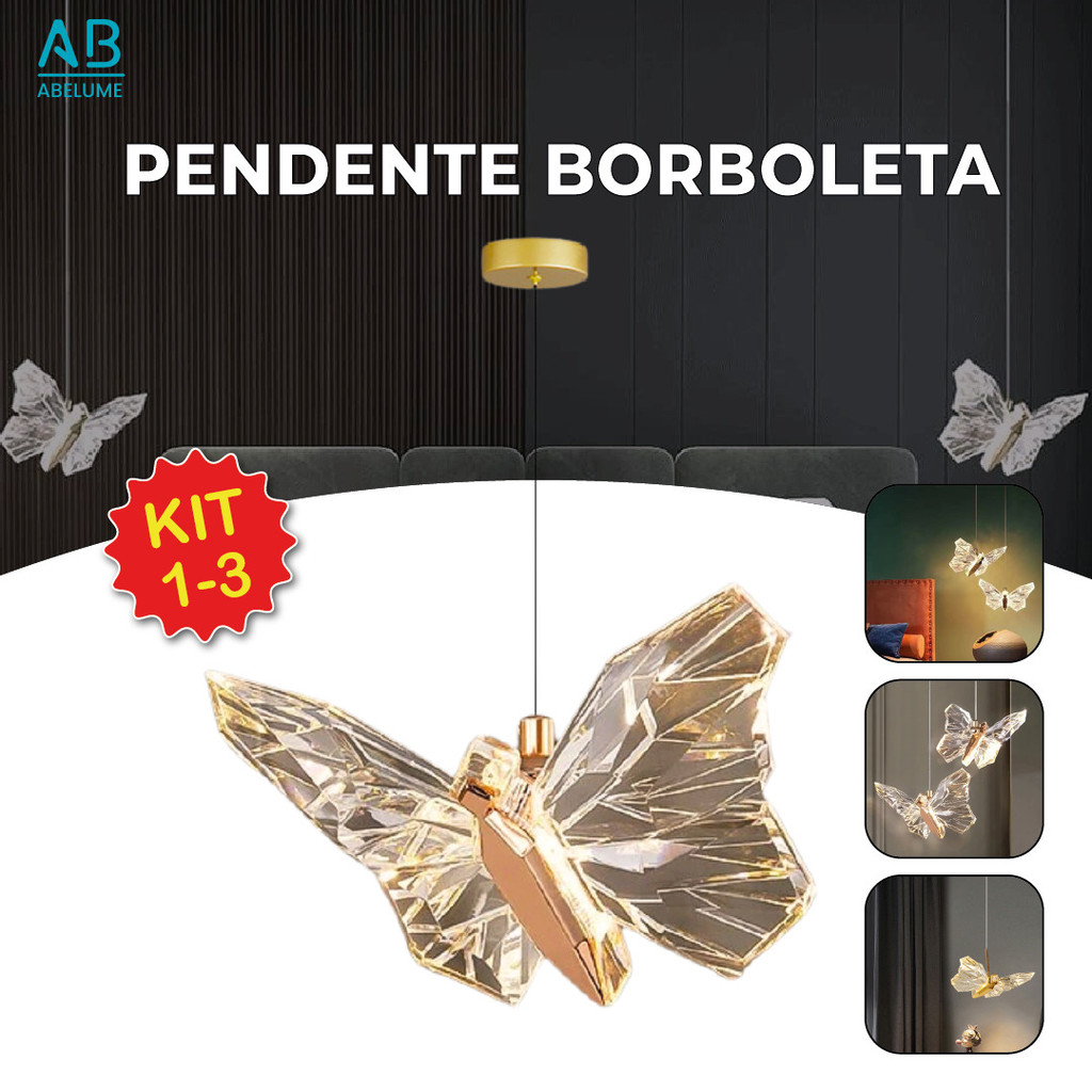 Luminária Pendente Lustre Borboleta de Luxo Cristal Dourada Moderna 3 Tons de Luz Bivolt