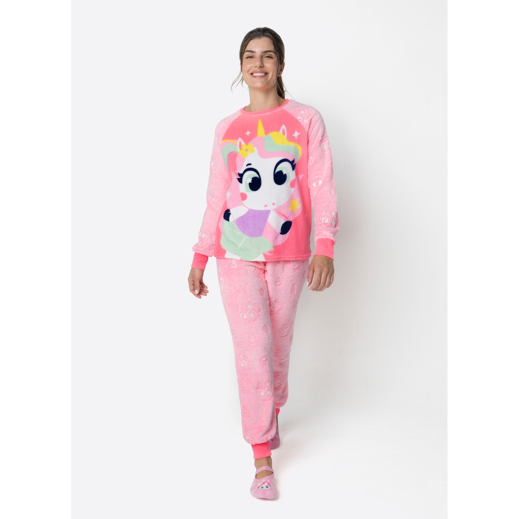 Pijama em coral fleece com estampa de Uni Encantada Puket O pijama tem estampa corrida que brilha no escuro! Possui toque macio devido a sua característica felpuda o que torna o pijama super quentinho e confortável. Ideal para aconchegar noites frias. Mangas longas com punhos em ribana; Gola redonda; Frente estampada, com estampa sem toque; Calça estampada com elástico macio na cintura; Calça modelagem reta com punhos em ribana; Lavagem e conservação: Lavagem à mão; não alvejar; não secar em tambor; não passar; não limpar a seco (para mais informações, consulte a etiqueta fixada ao produto). Garantia: Deverá ser encaminhado dentro da embalagem original; sem indicações de uso; acompanhado de nota fiscal e com todos os Itens constante na solicitação da compra. 100% Poliester