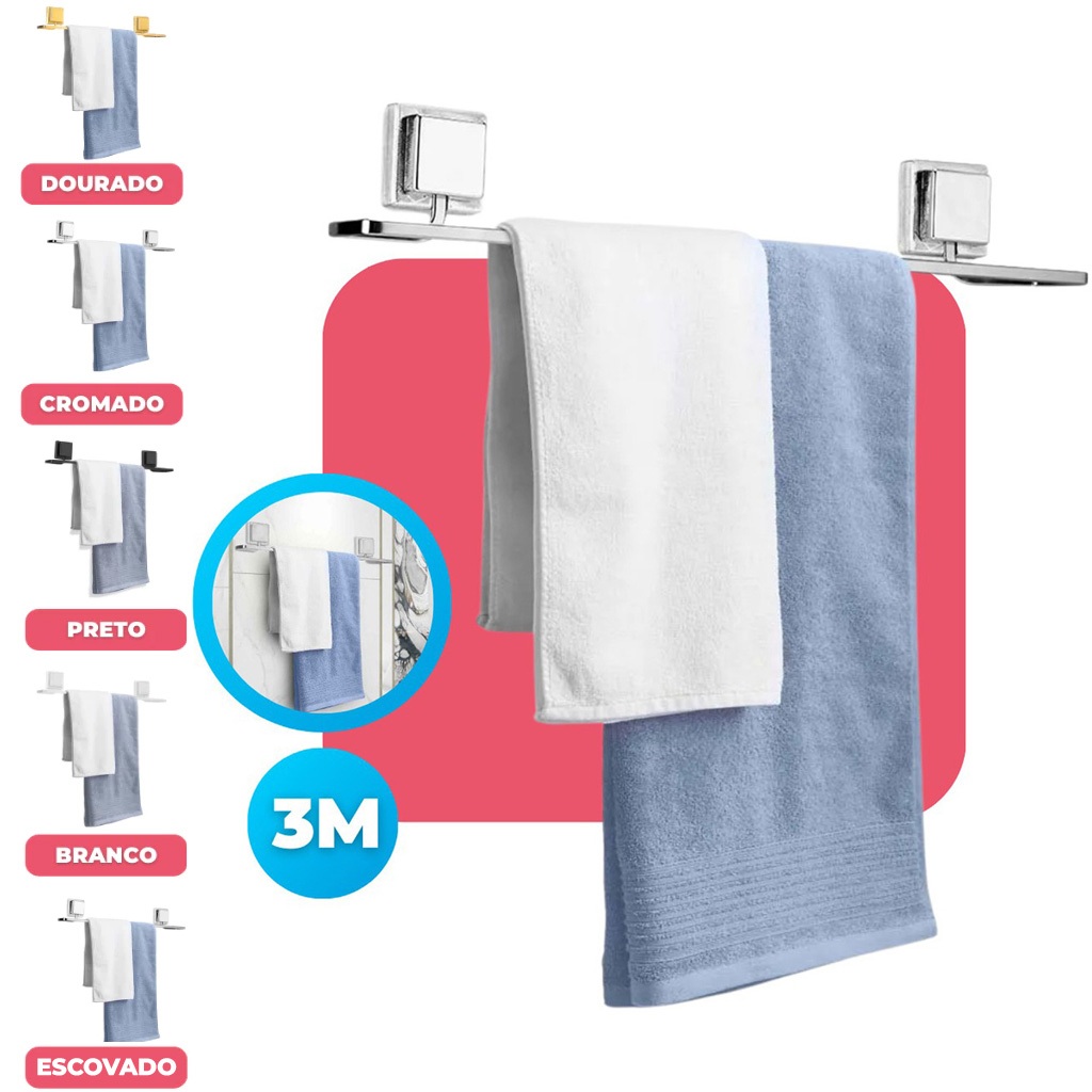 Suporte Porta Toalheiro Toalha de Banho Rosto Banheiro Sem Furo 3M Arthi Com design classico e elegante, o porta toalha de rosto e ideal para organizar seu banheiro ou cozinha. A fixacao e atraves de fita adesiva dupla face 3M extra fortes, sem o uso de ferramentas e furadeira. Praticidade que garante uma fixacao com seguranca em superficies planas como azulejos e vidros, atraves da succao a vacuo. Nao precisa de ferramentas para fixar. Caracteristicas: . Aco . Tamanho (Comprimentos x Largura x Altura): 50 x 7 x 7,4 cm . Marca: Arthi Conteudo da Embalagem: . 01 Suporte para Toalhas Importante: Garantia de 3 Meses. Valor Unitario. Imagens Meramente Ilustrativas. Nao nos responsabilizamos pelo mau uso do produto