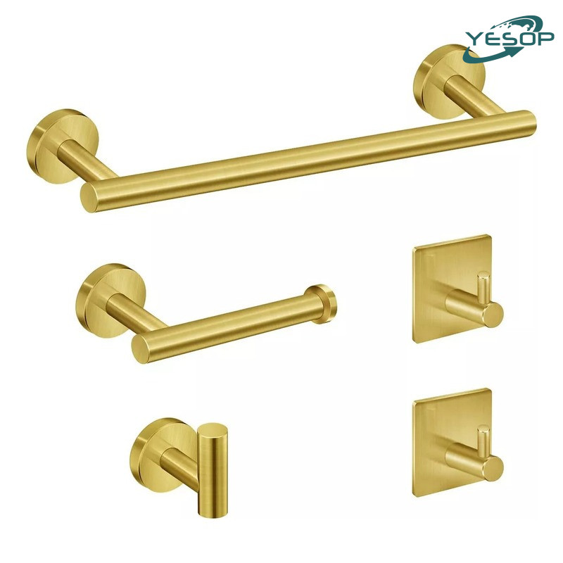 Kit de Acessórios para banheiro. Tamanho: Toalheiro: 40cm Porta-toalha de papel: 15cm Cor: Preto/Prateado/Dourado Material: aço inoxidável 304 Quantidade: 5 peças Método de instalação: instalação de adesivo/perfurador Adequado para: banheiro/cozinha Este elegante conjunto possui um design singular e moderno, por isso além de agregar beleza e requinte ao ambiente, é desenvolvido com produtos de qualidade. Já, a cor ouro escovado dos materiais, transmite luxo e modernidade ao cômodo. Além de tudo isso mencionado acima, o kit de acessórios é extremamente resistente, versátil e agrega a qualquer ambiente, um ar luxuoso na medida certa, pois por ter um design clean e sofisticado, o conjunto tornou-se parte integrante do espaço, conversando com os elementos do lavabo ,sem competir com eles.