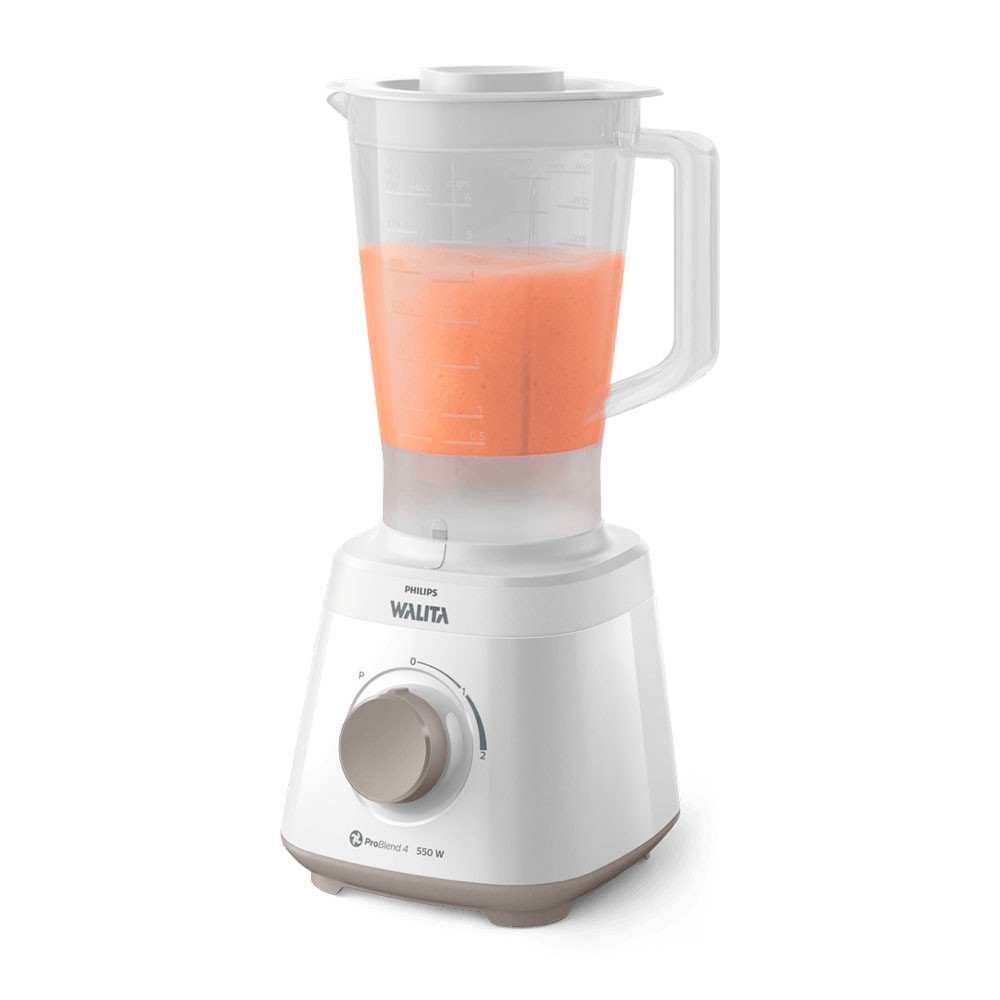 Para receitas saborosas e práticas, conheça o Liquidificador Philips Walita. Com tecnologia ProBlend, suas 4 lâminas serrilhadas de de aço inox, facilitam na hora da limpeza. Conta com 2 velocidades mais função pulsar e capacidade do copo de 2 litros. Motor de 550 W para um desempenho excelente e sem esforço no preparo de suas receitas favoritas. Modelo: Daily RI2110/01 PN: RI2110/01 Cor: Branco Marca: Philips Capacidade total: 2 litros Capacidade útil: 1,5 litros Velocidades: 2 + Pulsar Lâminas: 4 lâminas fixas Lâminas com ângulo diferenciado: Sim Tecnologia: ProBlend Tamanho do fio: 80cm Tipo de pino: 2 pinos Tipo de tomada: 10A Porta-Fio: Sim Material: Plástico Material da jarra: PP Base antiderrapante: Sim Alças: Sim Potência: 550W Consumo: 0,55 kw/h Frequência: 50-60Hz Voltagem: 110V Selo Inmetro: UL BR21.1957 Dimensões do produto (A x L x P): 39,2 x 17,3 x 19,1 cm Peso: 1,25 Kg Conteúdo da Embalagem: 01 x Liquidificador 01 x Manual de Instruções Garantia: 12 meses com a fabricante