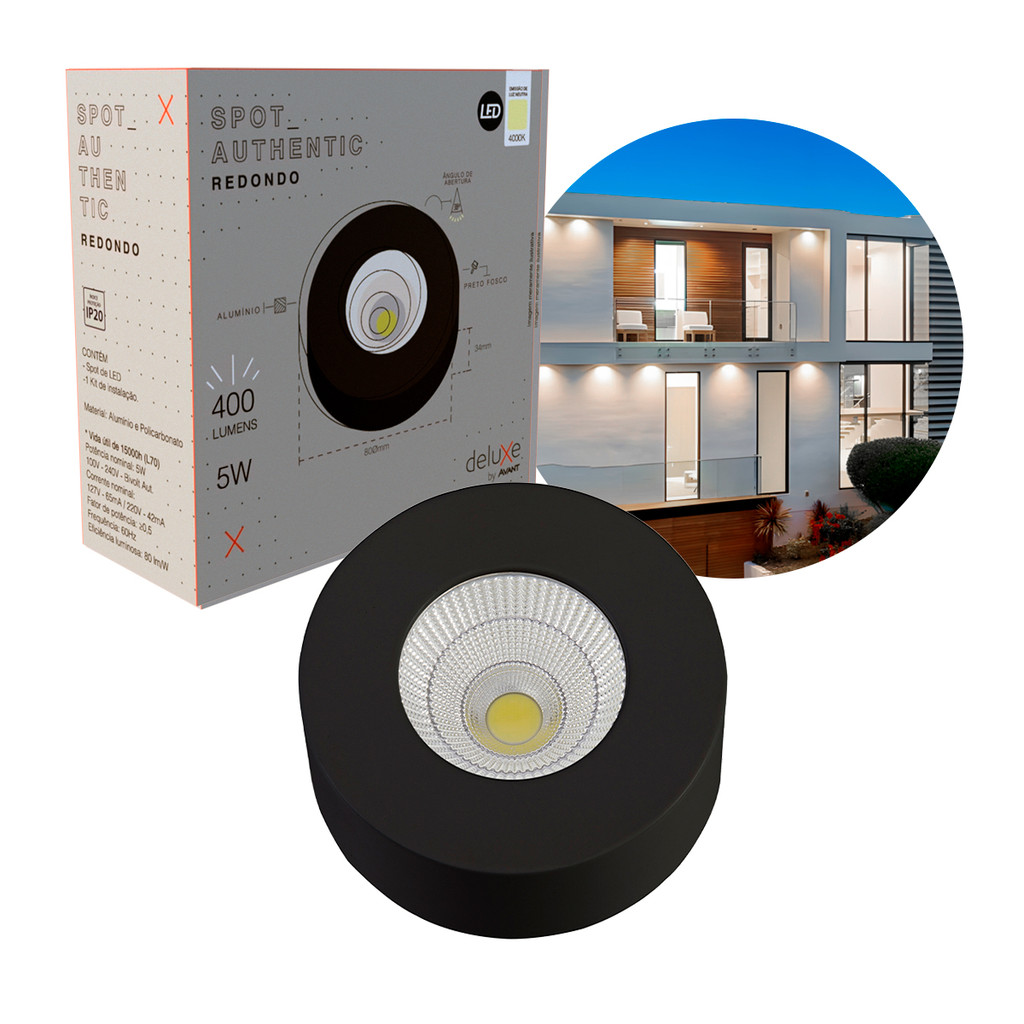 Luminária de Led Spot Authentic Sobrepor A Luminária de Led Spot Authentic Sobrepor oferece um toque de personalidade a qualquer ambiente. Seu design moderno e elegante, com corpo em alumínio e difusor em policarbonato, se integra perfeitamente a diversos estilos de decoração, tornando-a ideal para forros de gesso em salas de estar, salas de jantar, cozinhas, copas, banheiros, lavabos, halls, recepções, clínicas e consultórios. PROPRIEDADES: Temperatura de Cor: Neutra 4000K Potência: 5W Tipo de Instalação: Sobrepor Bivolt Modelo: Redondo Dimensões: A= 80mm, B= 34mm Peso: 123g Indice de Proteção: IP20 Uso: Interno IRC: =70 Ângulo de Abertura: 38º Não Dimerizável GARANTIA: 24 meses para defeitos de fabricação. SOBRE A MARCA: A Deluxe by avant, marca reconhecida por sua qualidade e inovação, oferece uma linha completa de soluções em iluminação, sempre buscando atender às necessidades dos seus clientes e oferecer produtos com design diferenciado, funcionalidade e alta performance. A marca se destaca por sua constante busca por aperfeiçoamento e desenvolvimento de novas tecnologias, que garantem a eficiência e a durabilidade dos seus produtos.