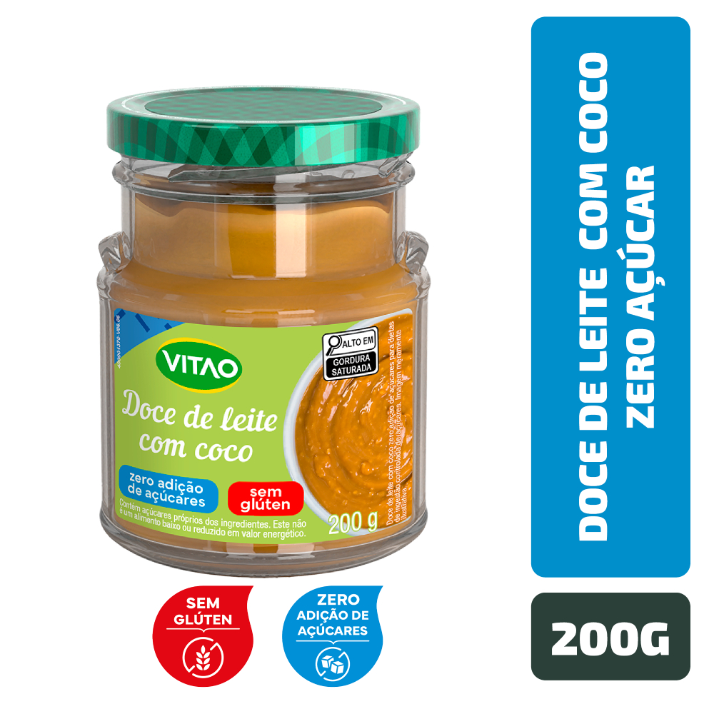 O doce de leite com coco da Vitao, é uma deliciosa opção sem açúcar e sem glúten. Indicado para atender às necessidades de pessoas que seguem dietas restritas, porém mantendo o sabor irresistível. Produzido em um ambiente livre de contaminação por glúten, garante a segurança para os intolerantes. Versátil e prático, pode ser consumido diretamente ou utilizado como ingrediente em diversas receitas. Mesmo sem adição de açúcares, não apresenta gosto residual de adoçante, assemelhando-se aos doces tradicionais. Ideal para quem busca uma opção saudável e saborosa. INGREDIENTES: Leite integral fluído, coco ralado, edulcorantes xarope de maltitol e sucralose, estabilizantes pectina cítrica e citrato de sódio, regulador de acidez bicarbonato de sódio e conservador sorbato de potássio. ALÉRGICOS: CONTÉM LEITE. NÃO CONTÉM GLÚTEN. CONTÉM LACTOSE. SEM GLÚTEN, ZERO ADIÇÃO DE AÇÚCARES.