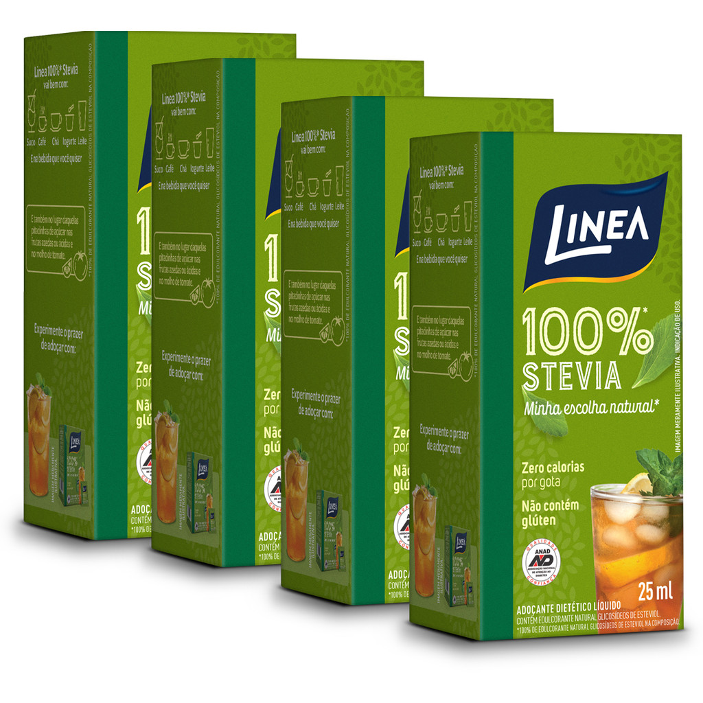 Adoçante Stevia Líquido Linea é derivado da planta stevia rebaudiana, sendo a garantia de um adoçante natural que contém a stevia como única substância que adoça. Pode ser combinado com a bebida de sua preferência, em que 4 gotas equivalem a 1 colher de chá de açúcar. Não eleva o açúcar no sangue e é 100% eliminado pelo organismo, podendo ser consumido por toda a família, até mesmo por portadores de diabetes. Não contém glúten, possui zero calorias por gotas e pode ser usado para uso culinário. 1 Kit composto por: 4 Unidades de Adoçante Stevia Líquido Linea 25ml (cada). INGREDIENTES: Água, edulcorante glicosídeos de esteviol, conservador benzoato de sódio e acidulante ácido cítrico. NÃO CONTÉM GLÚTEN.