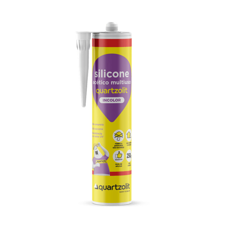 Silicone Acético Quartzolit é um selante incolor de cura acética com fungicida para áreas internas e externas. • Não amarela depois de aplicado. • Exclusiva ação antifungos! • Ideal para vedar superfícies de alumínio e não porosas. • Fácil aplicação. • Não escorre. • Forma uma borracha flexível. • Secagem em 24 horas para cordões de 3 a 4mm. CONTRA INDICADO PARA: • Não utilizar em vidros laminados, metais corrosíveis, espelhos, superfícies pintadas, aquários e concreto. • Não aplicar em plásticos à base de polietileno, polipropileno, policarbonato, acrílico e politetrafluoretileno. • Não utilizar em peças que terão contato com alimentos e imersão contínua em meios líquidos. • Não utilizar em fachadas de vidro e qualquer adesão estrutural que necessite resistência. • Não aceita pintura..