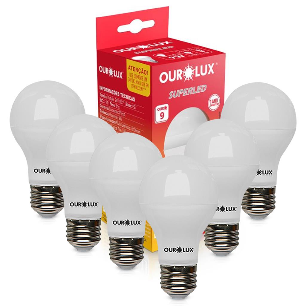 Codigo Interno: K01856 Codigo Fabricante: 05464 Codigo Referencia: 35358302085x6 Kit 6 Lampadas Led Bulbo A60 9w 24Vdc E27 6500K Luz Branca Ourolux A Ourolux uma empresa especializada em iluminacao com mais de 25 anos de experiencia e referencia no cenario nacional. Com uma variedade de produtos, a Ourolux esta presente em qualquer ambiente, com um design moderno, alem de seus produtos possuirem seguranca e qualidade. CARACTERISTICAS: Lancamento inedito da Ourolux, SUPERLED A60 9W, lampada a base de energia solar, que atraves de um sistema fotovoltaico ligado a uma bateria de 24V. E indicada para embarcacoes, navios, onibus, trailers e mais. Frequencia: 50/60Hz Sugestao de Uso: Utilizar em ambiente coberto. Observacao: A lampada funciona apenas em tensao de 24Vdc, acima disto ela queima. ESPECIFICACOES TECNICAS: Tensao Eletrica: 24VDC Potencia (W): 9 Formato do bulbo: A60 Base de conexao: E27 Fluxo Luz (lm): 810 Temp. Cor (K): 6500 (Branca Fria) IRC minimo: 80 Vida (horas): 15000 Dimerizacao: Nao compativel Temperatura Ambiente de operacao (?C): -10?C ~ +40?C Certificacao: Nao Requerida Garantia (anos): 1 EAN: 7899771502652 Peso (Kg): 0.610000 Prod. Altura (mm): 60 Prod. Largura (mm): 60 Prod. Comprimento (mm): 109 Tipo de Embalagem: Caixa Emb. Altura (cm): 11 Emb. Largura (cm): 6 Emb. Comprimento (cm): 6 Composicao: Polimero termoplastico, metal e componentes eletronicos. ORIENTACOES: Quando usada em tensao DC, utilize somente com transformador eletromagnetico; A vida util esta diretamente relacionada a temperatura de operacao; Utilize em luminarias capazes de dissipar calor. GARANTIA DO FORNECEDOR: 12 Meses.