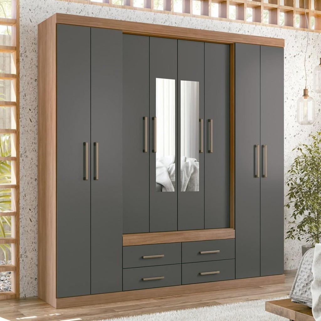 O Guarda Roupa Nápoles da Santos Andirá é um móvel prático e muito funcional. Ele se encaixa em qualquer ambiente de quarto de casal ou solteiro. Com 8 portas e 4 gavetas externas, esse roupeiro garante muito espaço para guardar todas as roupas. Puxadores em ABS garantem um design moderno além de suas portas recuadas. Internamente possui amplas prateleiras para guardar todos os pertences de forma organizada, assim como edredons, cobertores, caixas, sapatos, decoração, etc. Possui 3 cabideiros em alumínio para pendurar todas as roupas (casacos, vestidos, camisas, blusas, calças, etc.) com muita organização e segurança. Possui dois espelhos. O acabamento na cor madeirada é com verniz fosco, tudo dentro dos padrões de preservação do meio ambiente.! Estilo: Moderno Modular: Não Peso (kg): 130.2 Garantia: 03 Meses Altura (cm): 217.6 Acabamento: Pintura UV Largura (cm): 212 Possui Pés: Não Cor da Porta: Cinza Possui Gancho: Não Possui Nichos: Não Possui Portas: Sim Tipo de Porta: Bater Fita Integrada: Sim Porta Janelada: Não Possui Gavetas: Sim Tipo de Gaveta: Externa Possui Espelhos: Sim Profundidade (cm): 46.3 Escala de Brilho: Semi-Fosco Gaveta com Chave: Não Possui Calceiros: 1 Possui Capelinha: Não Possui Sapateira: Não Serviço Montagem: 114259443 Altura do Espelho: 75 Material da Porta: MDP Origem do Produto: Nacional Possui Cabideiros: Sim Possui Iluminação: Não Ambiente Principal: Quarto Formato do Espelho: Retangular Largura do Espelho: 20 Material da Gaveta: MDP Material Principal: MDP Possui Penteadeira: Não Possui Prateleiras: Sim Acabamento da Porta: Pintura Nicho com Cabideiro: Não Acabamento da Gaveta: Pintura Espessura do Espelho: 2.5 Tipo de Guarda-roupa: Casal Espessura do Fundo (mm): 3 Material da Prateleira: MDP Peso Máximo por Gaveta: 3 Possui Espelho Interno: Não Quantidade de Espelhos: 02 Espelhos com Tamanhos Iguais Espessura das Portas (mm): 15 Acabamento da Prateleira: Pintura Tipo de Puxador da Porta: Externo Escala de Brilho da Porta: Semi-Fosco Espessura da Estrutura (mm): 12 Tipo de Puxador da Gaveta: Externo Escala de Brilho da Gaveta: Semi-Fosco Peso Máximo por Prateleira: 3 Tipo de Corrediça da Gaveta: Metálica Telescópica Espessura das Prateleiras (mm): 12 Material do Puxador da Porta: ABS Possui Organizador de Gaveta: Não Escala de Brilho da Prateleira: Semi-Fosco Informações Complementares (Novo): Possui 02 espelhos Espessura do Fundo das Gavetas (mm): 2.5 Possui Espaço para Vestidos Longos: Não Tipo de Dobradiça/Corrediça da Porta: Telescópica Marca: Santos Andirá Cor Flex: Não Cor Interna: Jatobá Cor: Jatoba/Grafite Cor do Produto: Jatobá/Grafite Itens Inclusos: 1 Guarda Roupas, 1 Kit Ferragens e 1 Manual de Montagem Cor Predominante: Marrom Linha ou Coleção: Guarda-roupas Cor do Puxador: Marrom Quantidade de Cabideiros: 02 Cabideiros Quantidade de Prateleiras: 11 Prateleiras Quantidade de Portas: 8 Portas Quantidade de Gavetas: 04 Gavetas