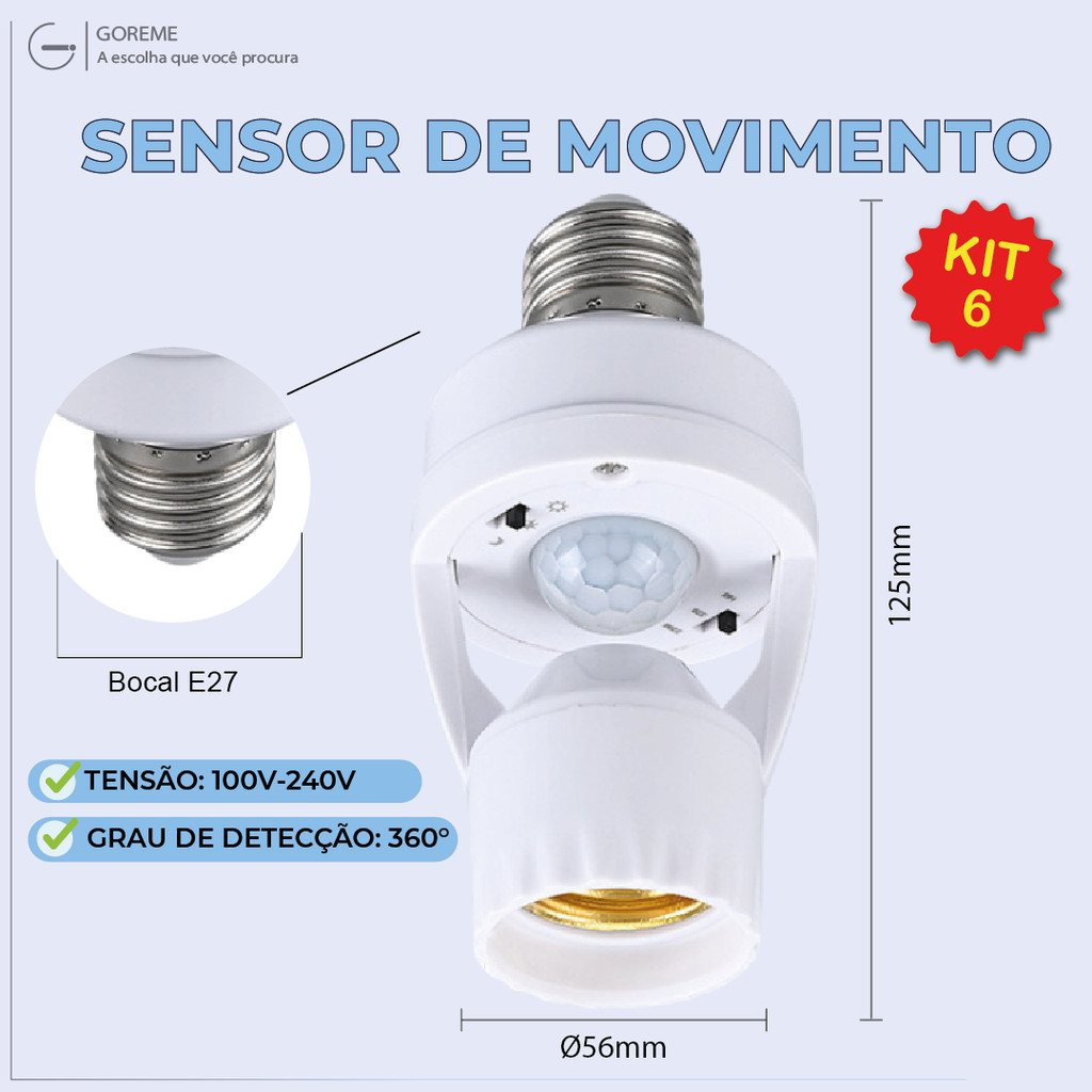 🌟 Sensor de Movimento para Lâmpada E27 com Sensor de Presença Bivolt 110V~220V - Máx 60W 🔧 Especificações Técnicas: Tensão: 100V-240V Carga Nominal: E27 1x60W Máx. Frequência: 50/60Hz Grau de Detecção: 360° Faixa de Detecção: Até 6 metros (a <24°C) Configuração do Tempo: 16s - 32s - 220s (ajustável) Sensibilidade de Luz: Alta / Média / Baixa IP: 20 Dimensões: Ø56 x 118mm 💡 Características: Detecta movimentos em 360°, ideal para ambientes internos. Faixa de detecção de até 6 metros. Ajuste de tempo para manter a lâmpada ligada após a detecção de movimento. Níveis de sensibilidade à luz ajustáveis. Perfeito para economia de energia e praticidade em áreas de passagem!