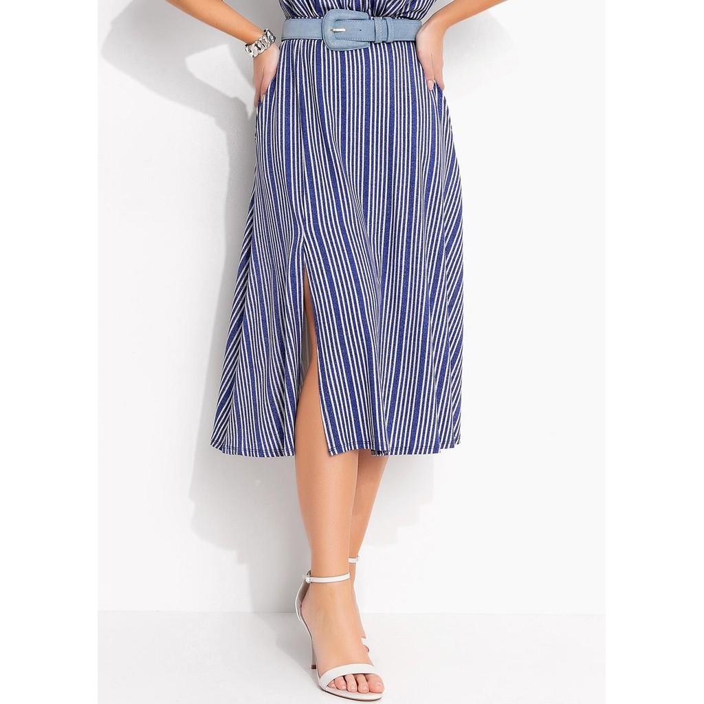 Saia listrado azul, modelagem solta, modelo evasê, bolsos, fenda frontal, comprimento midi, material malha de viscose com elastano. Tabela de Medidas: P (36 até 38): Busto: 80 até 88 cm | Cintura: 64 até 72 cm | Quadril: 88 até 96 cm M (40 até 42): Busto: 88 até 96 cm | Cintura: 72 até 80 cm | Quadril: 96 até 104 cm G (44 até 46): Busto: 96 até 100 cm | Cintura: 80 até 88 cm | Quadril: 104 até 112 cm GG (48 até 50): Busto: 104 até 116 cm | Cintura: 88 até 100 cm | Quadril: 112 até 124 cm XXG (52 até 54): Busto: 116 até 128 cm | Cintura: 100 até 112 cm | Quadril: 124 até 136 cm XLG (56 até 58): Busto: 128 até 140 cm | Cintura: 112 até 124 cm | Quadril: 136 até 148 cm. Este produto é destinado apenas para consumidores finais (CPF). Não realizamos a venda para CNPJ.