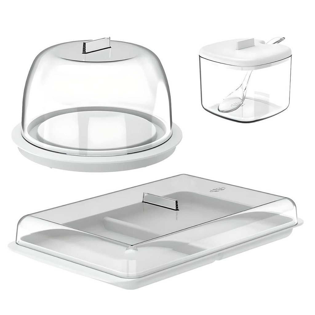 Kit Café da Manhã Porta Frios + Porta Queijo + Açucareiro 200ml KTE144 - Ou Transforme a organização e o serviço à mesa com o Combo Break da OU, que traz praticidade e estilo em três produtos essenciais. O Porta Frios Duplo Com Tampa Break é ideal para quem deseja manter os frios sempre frescos e bem organizados. Com design minimalista e harmonização perfeita entre cor e transparência, este item é versátil, combinando com qualquer estilo de cozinha. Sua tampa transparente facilita a visualização, enquanto o acabamento polido no interior garante fácil limpeza, e o acabamento texturizado na parte externa minimiza riscos, garantindo durabilidade e beleza. O Porta Queijo Minas Break é indispensável para conservar e servir queijos com praticidade e elegância. Assim como o porta frios, ele é fabricado em polipropileno resistente com cúpula em poliéster transparente, permitindo que o queijo seja visto sem a necessidade de abrir a tampa. Seu design também proporciona fácil limpeza e resistência, assegurando que sua mesa esteja sempre organizada e visualmente atraente. Completa o conjunto o Açucareiro Break 200ml, uma peça compacta e funcional que traz praticidade ao servir açúcar. Com o mesmo design refinado e materiais de alta qualidade dos outros itens do combo, o açucareiro é perfeito para qualquer ocasião, seja no dia a dia ou em eventos especiais. A linha Break é a escolha certa para quem valoriza a combinação de praticidade, durabilidade e beleza. Especificações Marca: OU Modelos: Porta Frios Duplo Com Tampa Break, Porta Queijo Minas Break, Açucareiro Break 200ml Material: Base em Polipropileno (PP) e tampas/cúpulas em Poliestireno (PS) Capacidade Açucareiro: 200 ml Acabamento Interno: Polido (facilita a limpeza) Acabamento Externo: Texturizado (minimiza riscos) Design: Minimalista e elegante