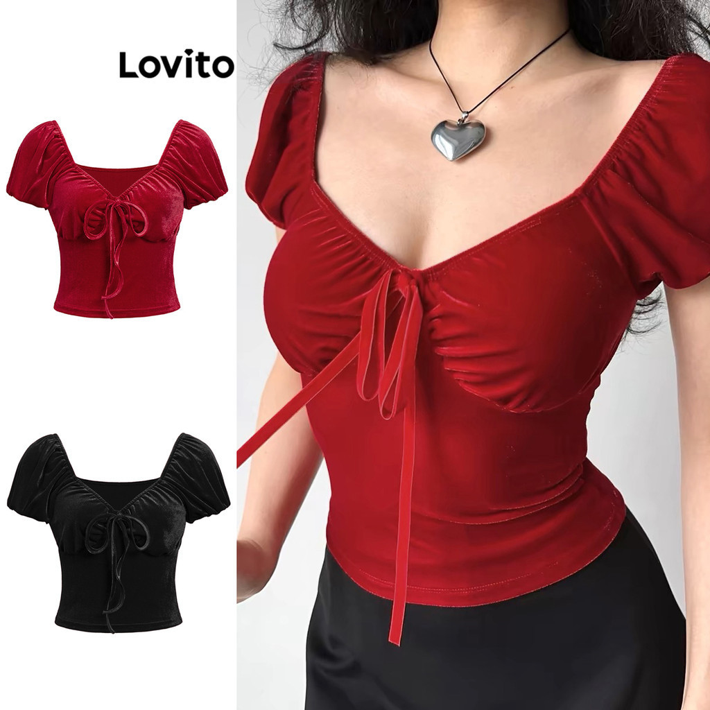 Lovito Camiseta Casual Com Laço Liso Frontal Plissada Para Mulheres L87ED215 - 31% OFF | Women Clothes