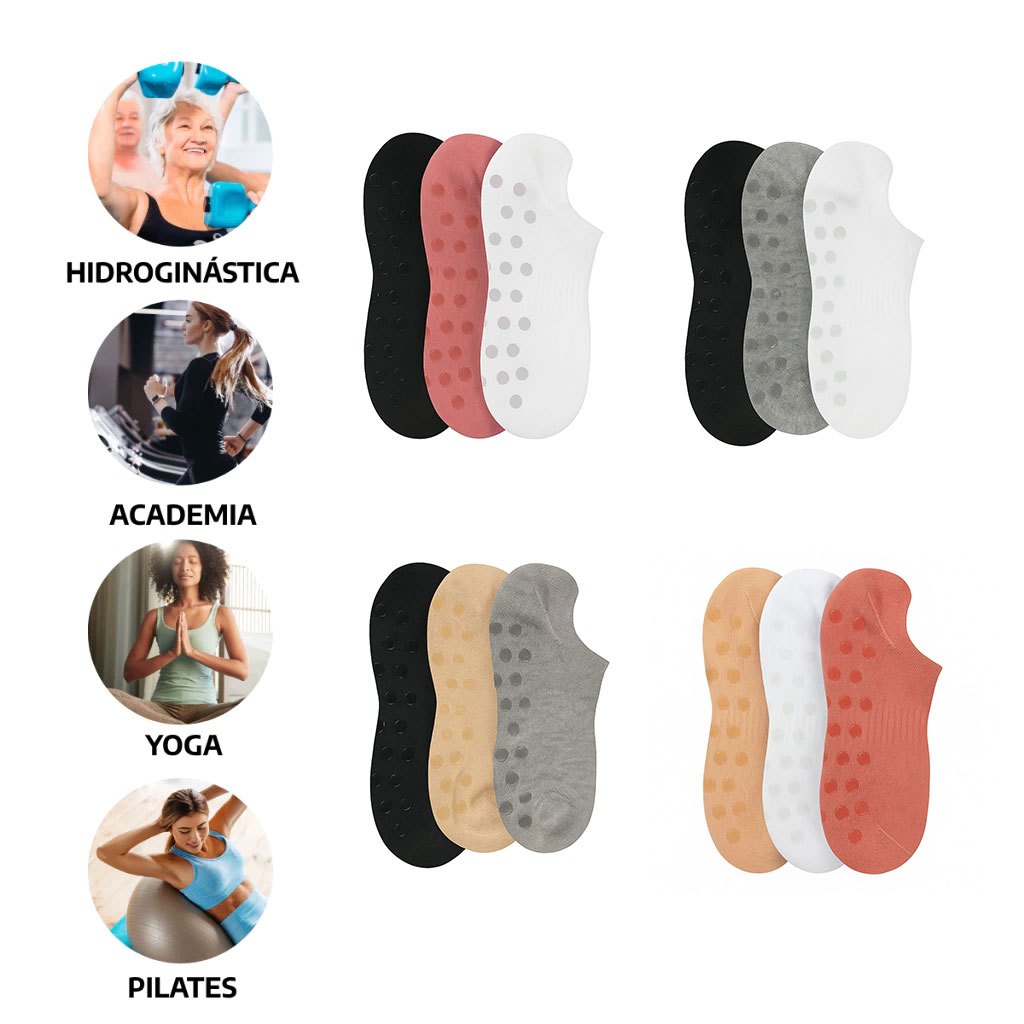 Kit 3 Pares de Meias de Yoga Antiderrapantes Ideal para práticas de yoga, pilates, hidroginástica e exercícios aeróbicos, o Kit com 3 pares de Meias Antiderrapantes oferece o equilíbrio perfeito entre conforto, aderência e respirabilidade. Sobre o Produto: Quantidade: Kit com 3 pares de meias Composição: 95% poliéster, 5% elastano Tamanhos disponíveis: 34-38 e 39-44 Tamanho 34-38 Cores disponíveis: Bege - Cinza - Rosa - Branco - Preto Tamanho 39-44 Cores disponíveis: Preto - Branco - Cinza - Marinho Envio: O kit é enviado de forma aleatória, podendo haver repetição de cores Principais Características: - Solado Antiderrapante; - Modelo Soquete (Cano Curto); - Calcanhar Verdadeiro; - Punho Soft; - Costura Reforçada; - Tecido Respirável. Gênero: Unissex Informações técnicas: Solado Antiderrapante: Tecnologia que proporciona aderência ao solo, evitando escorregões e garantindo mais estabilidade nos movimentos. Modelo Soquete (Cano Curto): Ideal para uso com tênis e outros calçados baixos, sem deixar marcas visíveis. Calcanhar Verdadeiro: Ajuste anatômico que impede a meia de sair ou escorregar do pé. Punho Soft: Elástico macio que proporciona conforto extra sem apertar o tornozelo. Costura Reforçada: Acabamento resistente nas pontas e compressão no meio do pé para maior durabilidade e suporte. Tecido Respirável: Mantém os pés frescos e secos durante os treinos. Indicação de Uso: - Yoga, pilates, dança, hidroginástica, fisioterapia e academia; - Caminhada, corrida, tênis e outros esportes; - Uso casual para conforto diário. Uso diário e conforto: - Caminhada em casa (pisos escorregadios); - Uso hospitalar (pacientes em recuperação); - Uso em asilos e casas de repouso para idosos; - Uso infantil para evitar quedas em superfícies lisas; - Uso em escritórios ou ambientes internos sem sapatos; Esse kit de meias proporciona segurança, estabilidade e máximo conforto para seus pés.