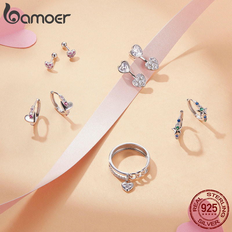 Brincos Bamoer 925 Sterling Sliver Stud Em Forma De Coração Jóias Arco-Íris Para Mulheres