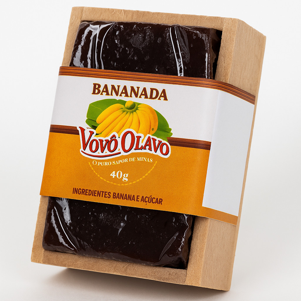Bananada Mini Vovô Olavo – 40g | Caixinha de Madeira Artesanal A clássica bananada mineira que conquista pelo sabor e pela apresentação! A Bananada Vovô Olavo é produzida em Ponte Nova – MG com banana e açúcar, seguindo a tradição. Vem embalada em uma charmosa caixinha de madeira, tornando-se uma excelente opção para presentes, kits temáticos e lembranças especiais. ℹ️ Benefícios: ✅ Feita com banana e açúcar – sem conservantes ✅ Caixinha de madeira – ideal para presente ✅ Sabor autêntico de Minas Gerais ✅ Embalagem individual de 40g – prática e elegante ✅ Sem glúten ℹ️ Ficha Técnica: ✅ Produto: Bananada artesanal ✅ Marca: Vovô Olavo ✅ Peso líquido: 40g ✅ Ingredientes: Banana e açúcar ✅ Embalagem: Caixinha de madeira natural ✅ Armazenamento: Conservar em local seco e arejado ✅ Origem: Ponte Nova – MG *Imagens Ilustrativas