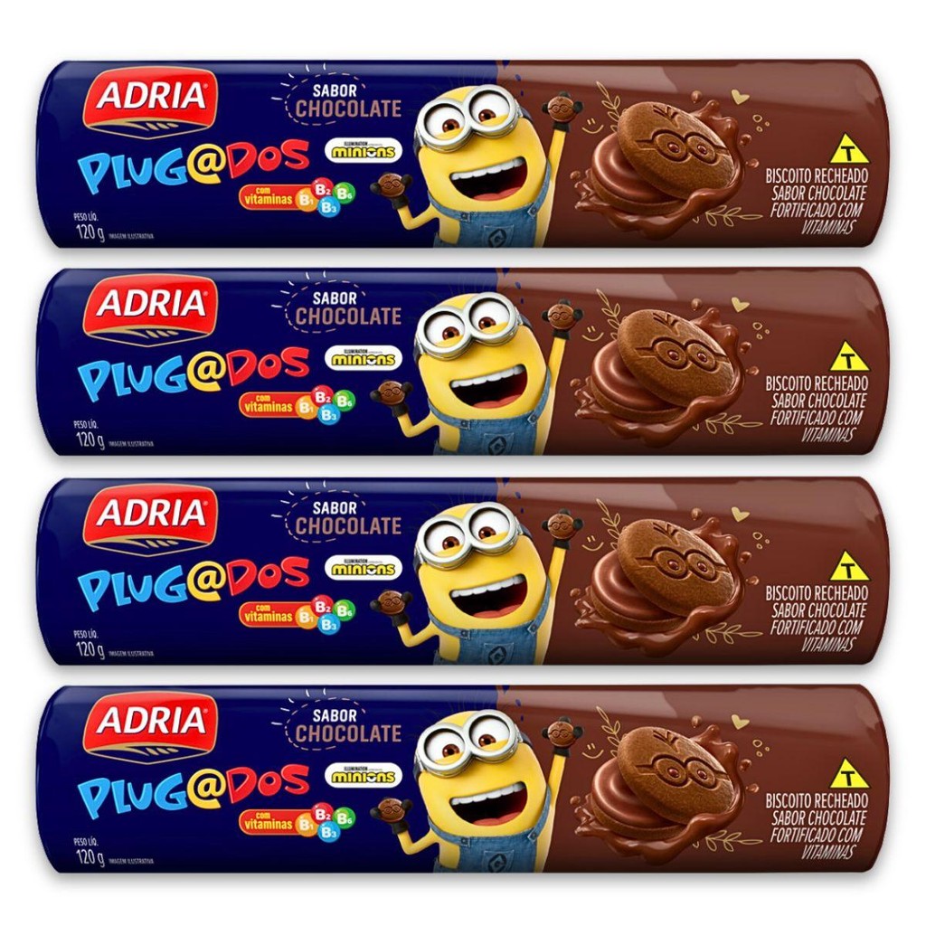 Biscoito Chocolate Recheio Chocolate Fortificado com Vitaminas Minions Adria Plugados Pacote 120gIngredientes: Farinha de trigo enriquecida com ferro e ácido fólico, açúcar, gordura vegetal, açúcar invertido, cacau em pó, amido de milho, sal, vitaminas: B3, B2, B6 e B1, fermentos químicos: bicarbonato de amônio, bicarbonato de sódio, di-hidrogenodifosfato de cálcio e di-hidrogenofosfato de cálcio, corantes: caramelo IV e carmim, aromatizantes e emulsificante lecitina de soja.