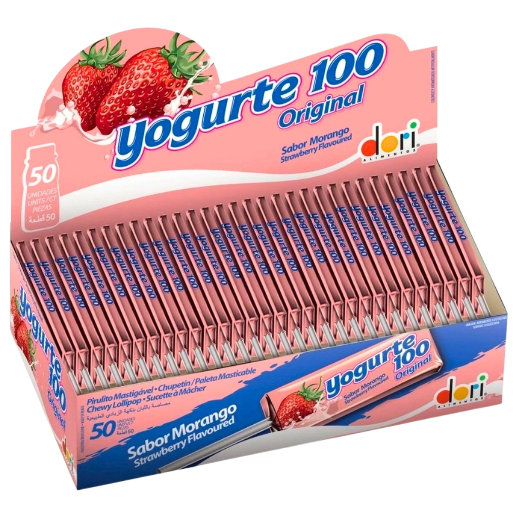 Pirulito mastigável sabor artificial de iogurte de morango, colorido artificialmente. Perfeito para festas, lembrancinhas, kits e revenda. Ingredientes: Açúcar, xarope de glicose, gordura vegetal, acidulante ácido cítrico, emulsificantes, lecitina e mono e diglicerídeos de ácidos graxos, aromatizante e corante artificial vermelho Allura AC. Quantidade: 50 unidades • Peso por unidade: 11,2 g • Indicado para: festas, lembrancinhas, kits, consumo e revenda. • Conservação: Manter em local seco e fresco NÃO CONTÉM GLÚTEN. ALÉRGICOS: CONTÉM DERIVADOS DE SOJA. Somos uma loja especializada em artigos de festa, confeitaria, embalagens e doces com lojas físicas no estado de São Paulo, desde 2002.