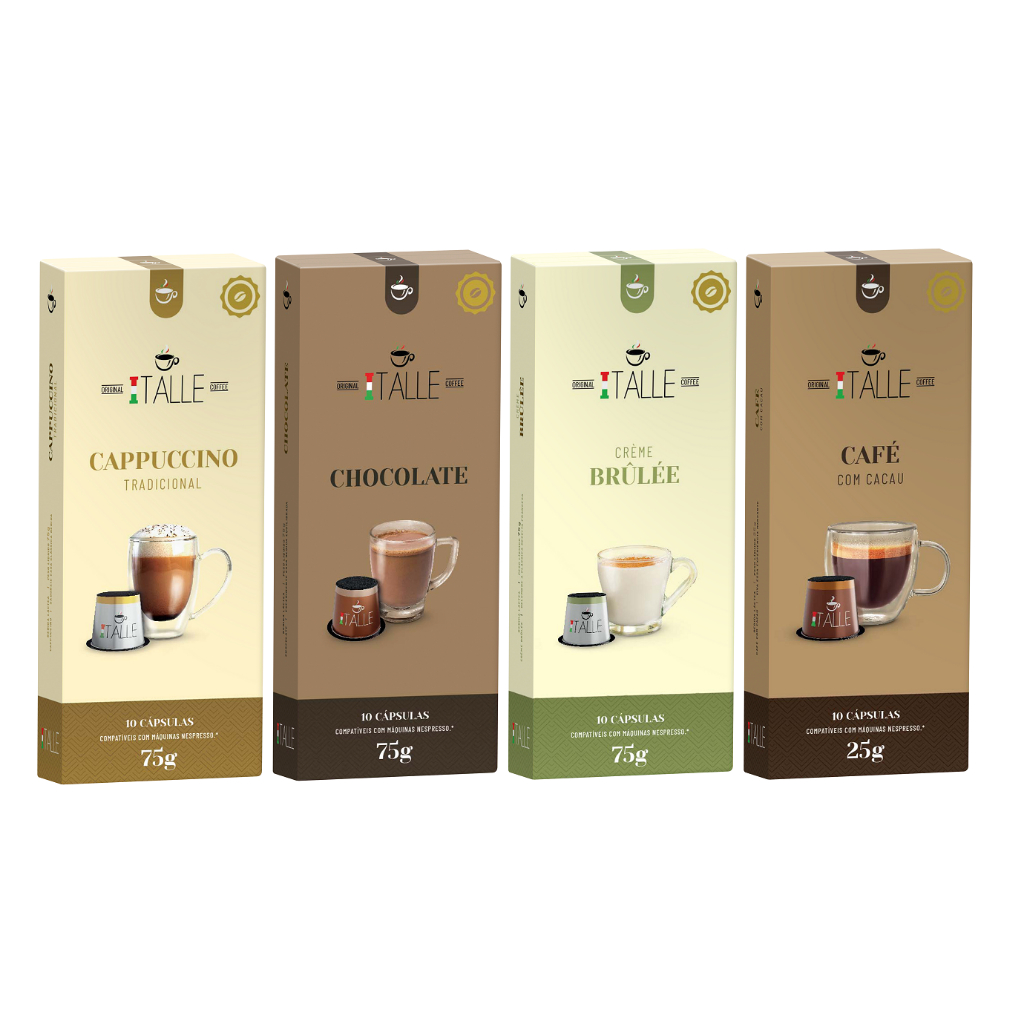 CAPSULAS COMPATIVEIS COM TODAS AS MAQUINAS NESPRESSO OBS: - NÃO É COMPATÍVEL COM A MÁQUINA VERTUO E VERTUO POP DELTA Q TRES CORAÇOES. KIT 40 CÁPSULAS COMPATÍVEL COM NESPRESSO - 10 cápsulas Creme Brulee - 10 cápsulas Chocolate - 10 cápsulas Cappuccino - 10 cápsulas Café Cacau CREME BRULEE CAFE ITALLE Café Italle Sabor Crème Brûlèe Um das receitas mais clássicas da França direto para o seu paladar. Nosso Crème Brûlée traz a máxima cremosidade com o toque delicioso da baunilha para te surpreender. Prove também com um toque de canela em pó, para um sabor ainda mais elaborado. CAPPUCCINO TRADICIONAL ITALLE: O cappuccino Italle é ideal para os fãs dessa bebida que conquistou o mundo. Nossas cápsulas combinam com café, chocolate e leite da mais alta qualidade, com o toque certo de canela, proporcionando a cremosidade perfeita para qualquer momento do dia. Deixe sua bebida ainda mais gostosa adicionando chantily e um toque de achocolatado em pó. CHOCOLATE CAFE ITALLE O clássico chocolate quente, cremoso e delicioso, para envolver seu paladar. Nossa versão traz o melhor do cacau brasileiro, com leite de alta qualidade, para que você saboreie uma bebida equilibrada e surpreendente. Finalize com um pouco de chantili para potencializar ainda mais a textura. CAFÉ COM CACAU ITALLE: Prove nossa versão Café com Cacau, que une o sabor marcante do café com um delicioso toque de chocolate, surpreendendo no paladar. Adicione leite para potencializar a cremosidade da bebida. Experimente seu momento Italle! Experimente seu momento Italle! ALÉRGICOS: CONTÉM LEITE E DERIVADOS, E DERIVADOS DE SOJA.